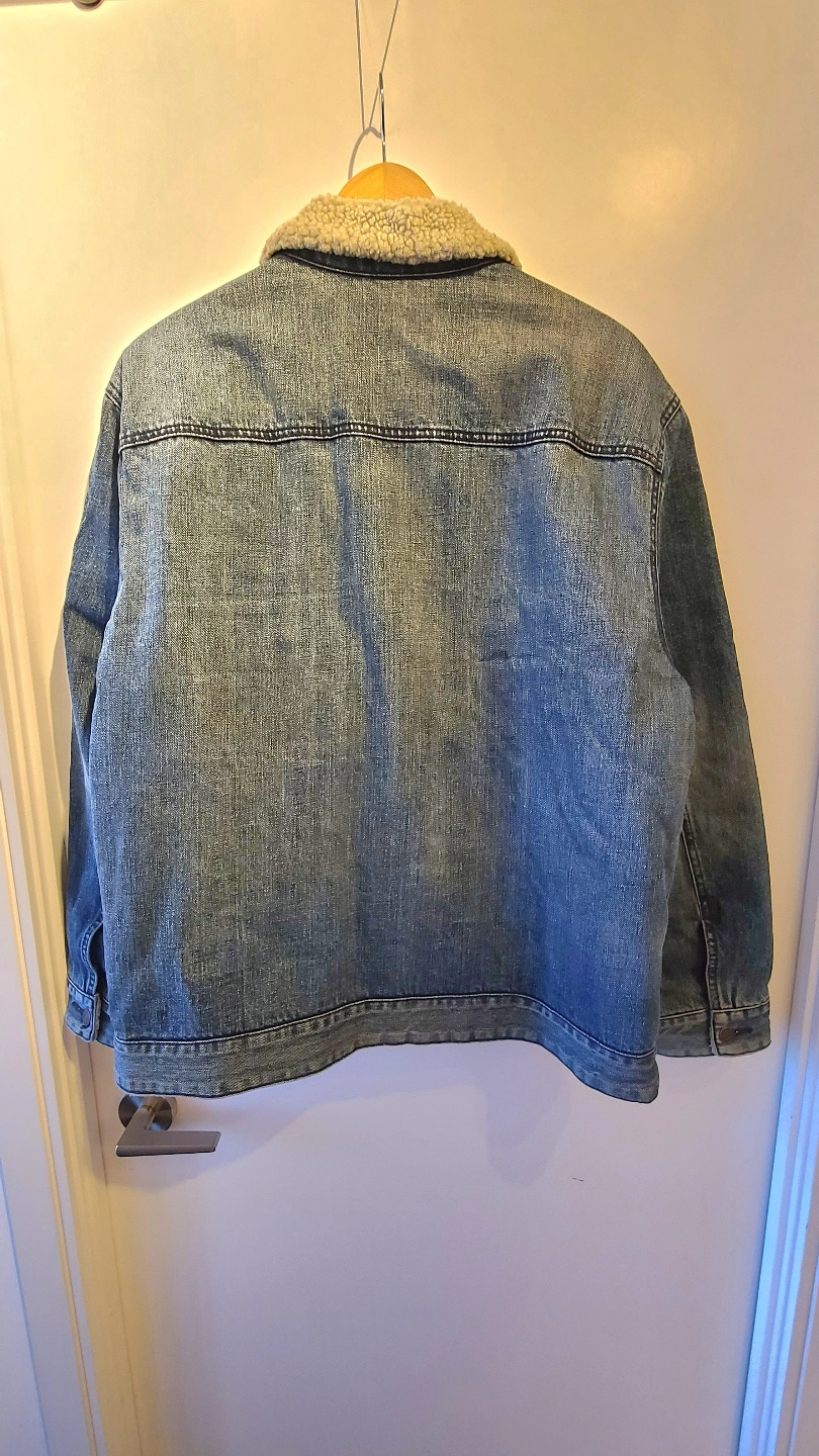 Men's denim jacket. Light wash denim. Sherpa lining. Two front pockets. Size Large.