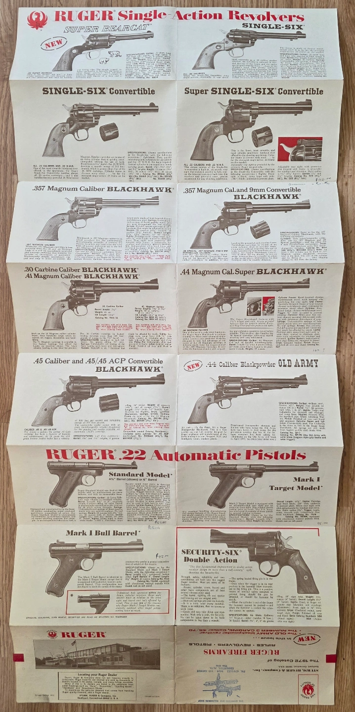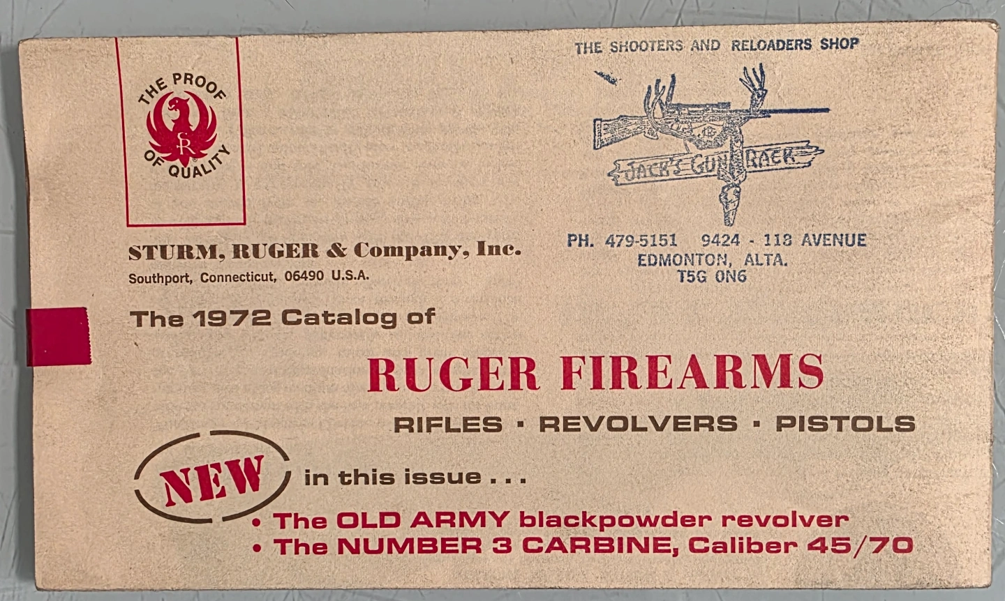 Vintage 1972 Ruger Firearms catalog. Shows various models and specifications. Excellent collectible piece for enthusiasts.