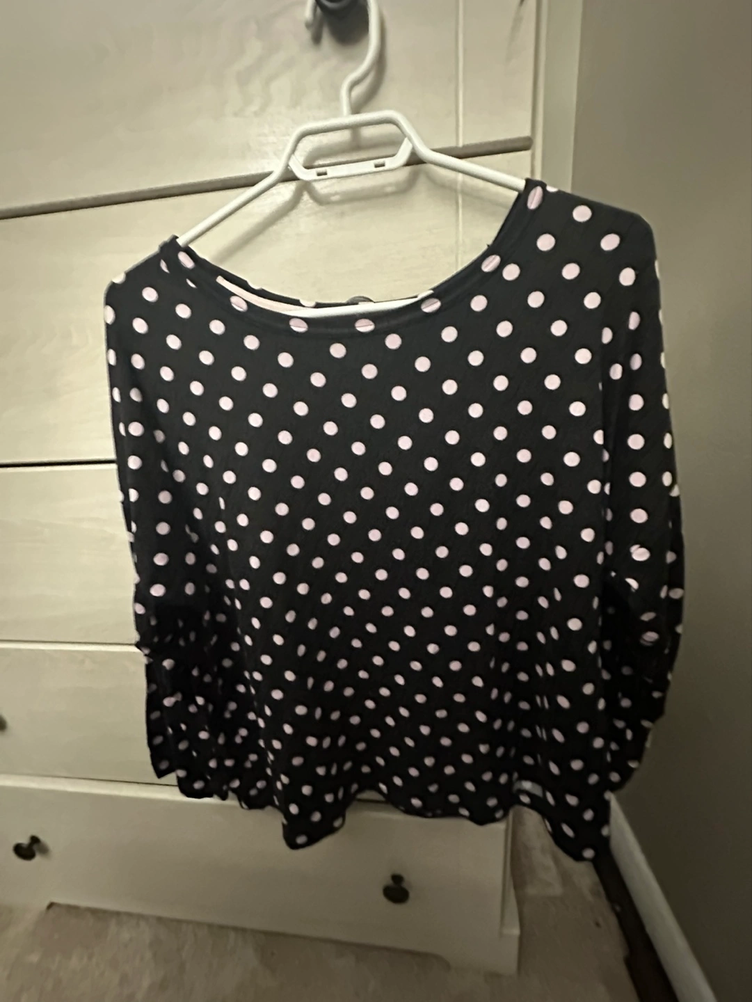 Says size small but I’m medium usually and fits me like twice my size Long sleeve, polka dot top. Round neck. Casual style. Great for everyday wear.