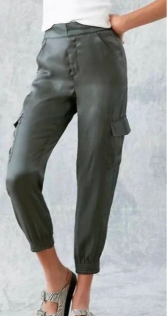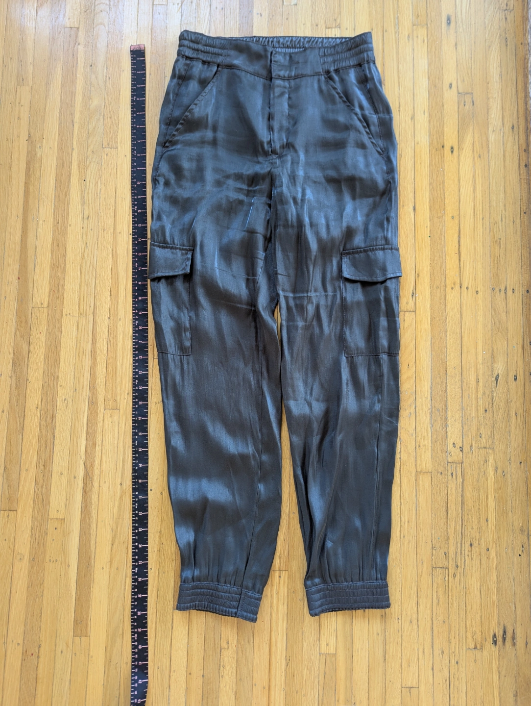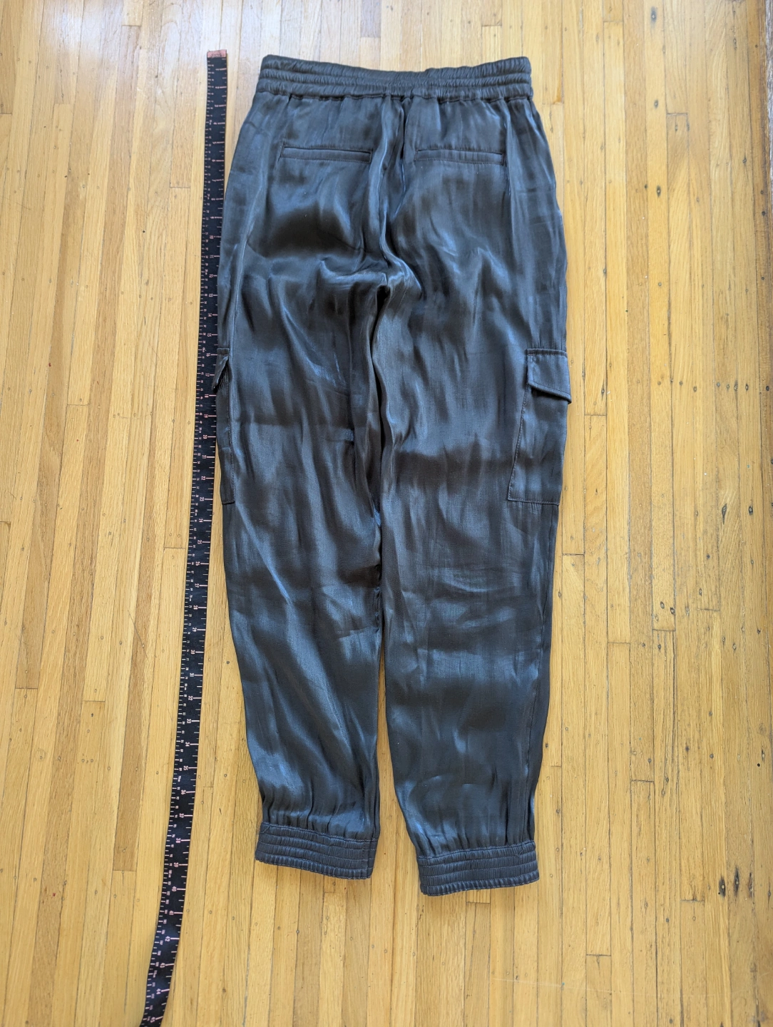 Dark olive green satin cargo pants. Elastic waistband and cuffs. Side pockets and cargo pockets. Excellent condition. PICK UP 10th and Blanca OR UBC. I'm having a closet clean out of great mostly womens clothes! :) Check out my other ads for more shirts, jeans, dresses and more! Aritzia, lulu, etc. Willing to bundle for multiple items.