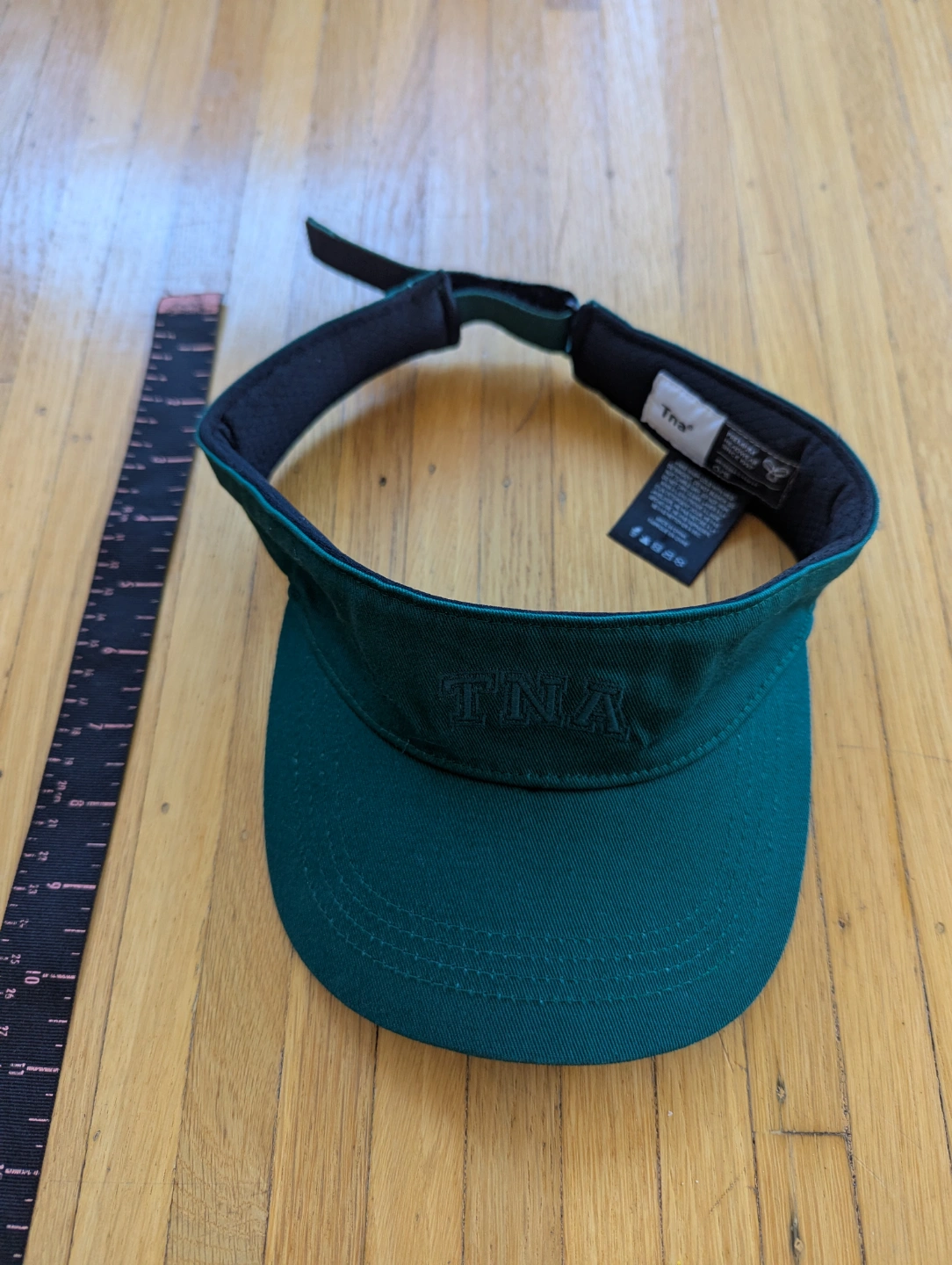 Dark green visor. Adjustable velcro strap. Excellent condition, never worn.