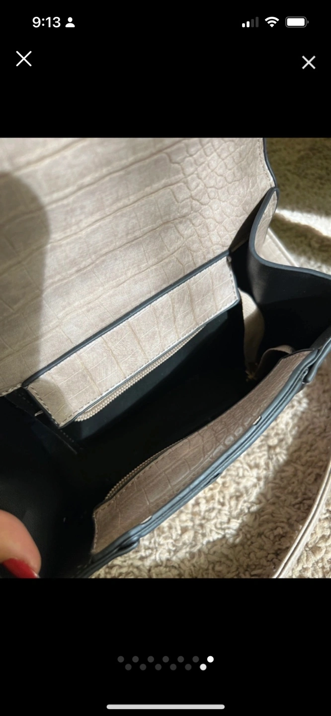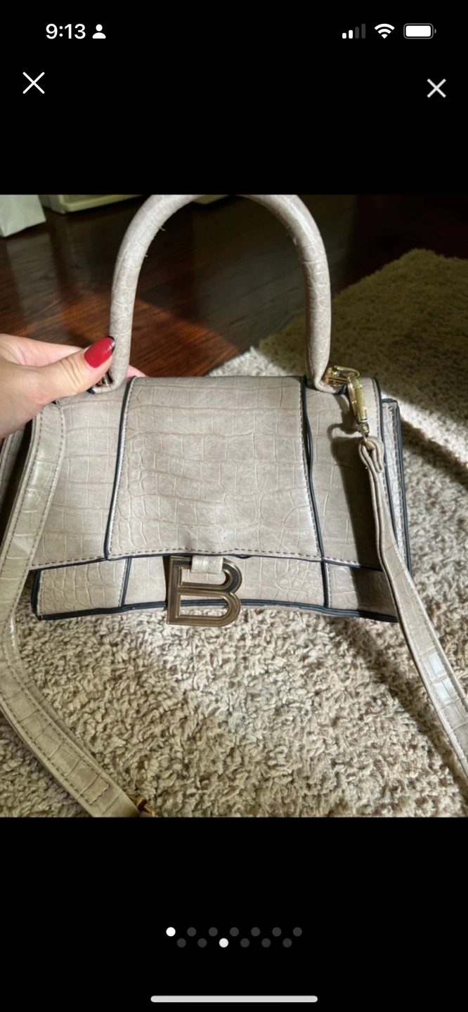 Stylish handbag, beige colour. Crocodile-embossed texture. Features a top handle and a detachable shoulder strap. Gold-tone hardware. Subtle B logo detail.