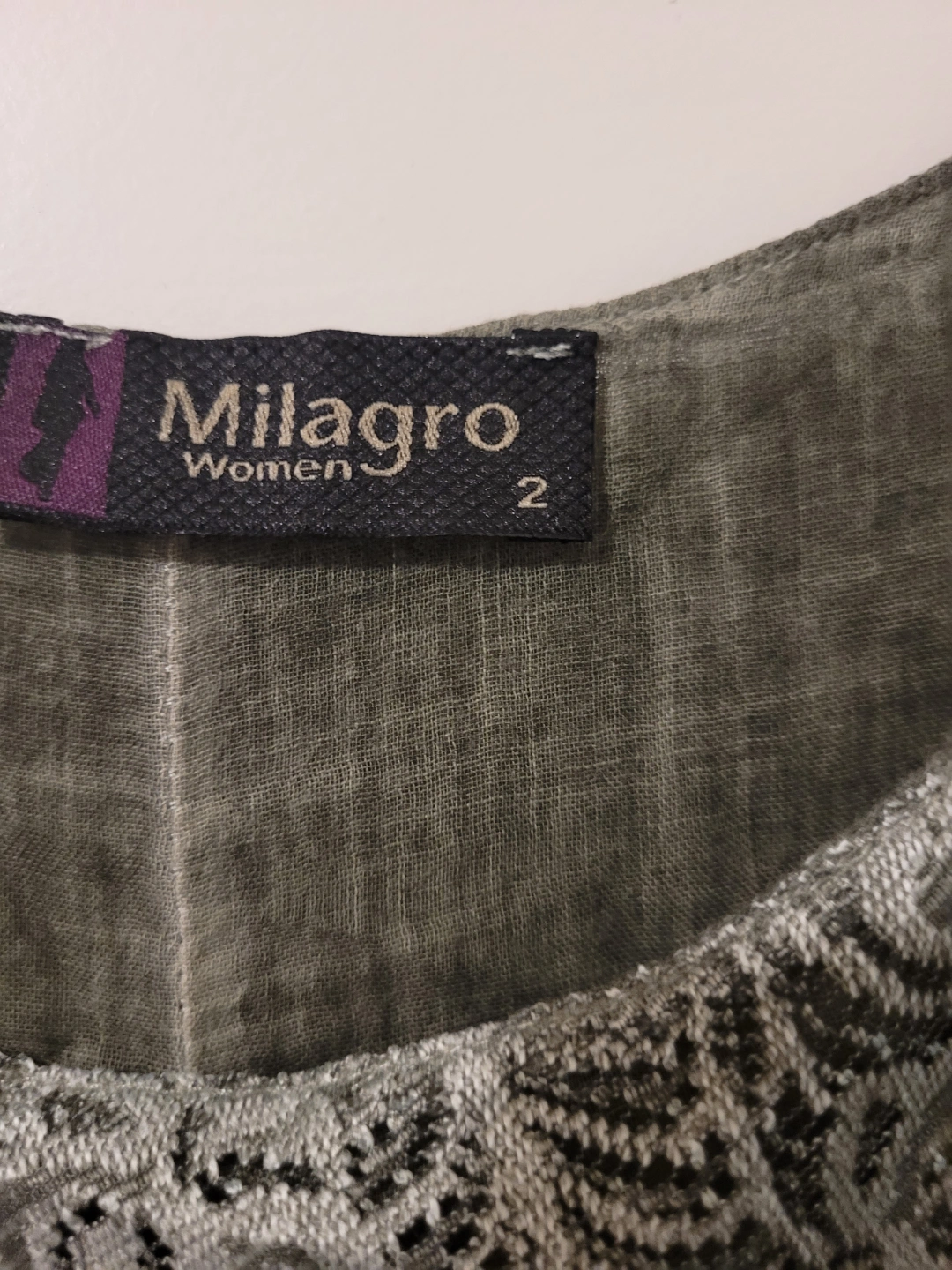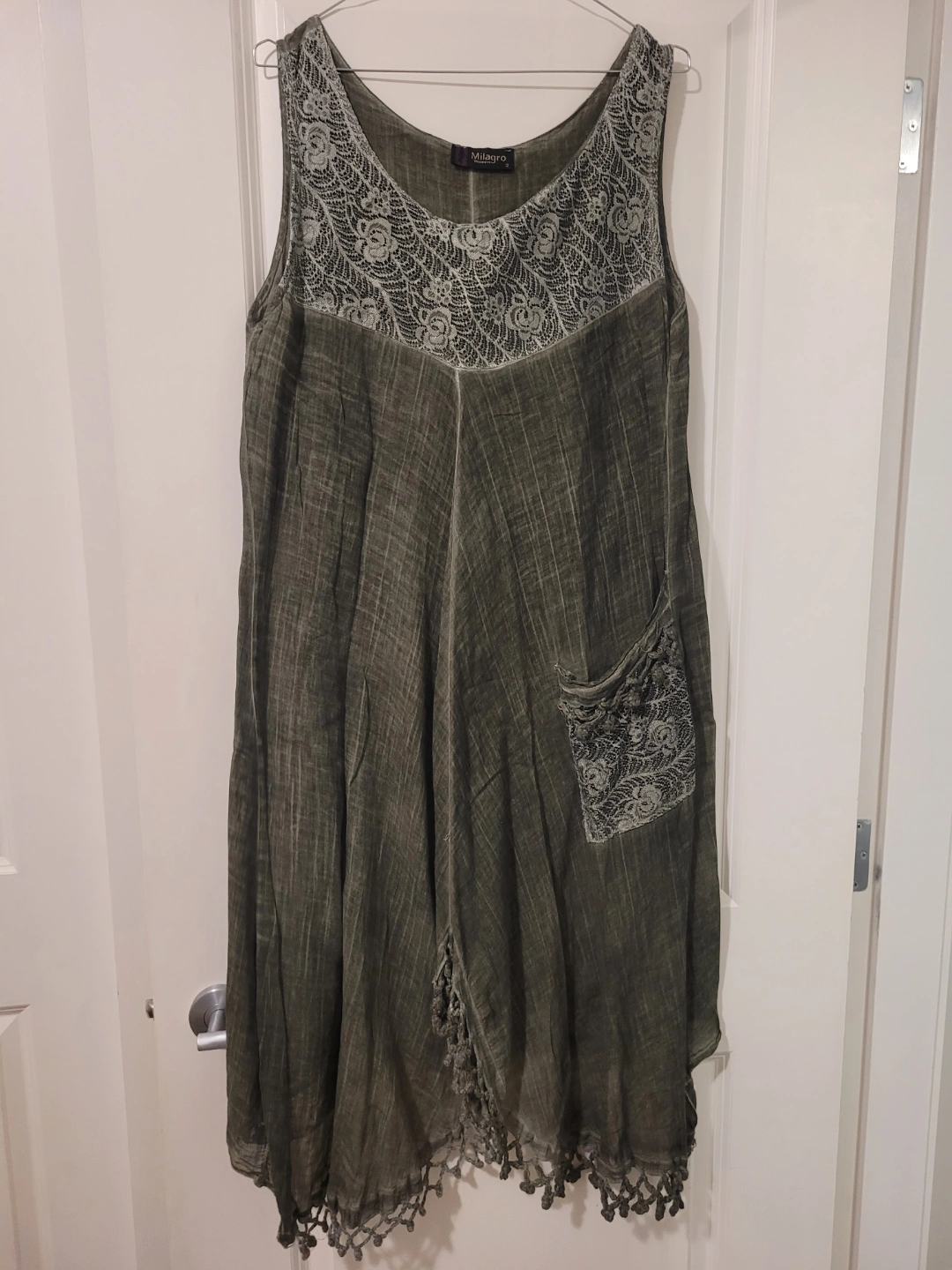 Olive green sleeveless sundress. Features delicate lace detailing and a side pocket. Relaxed fit. Crochet trim along the hem.
