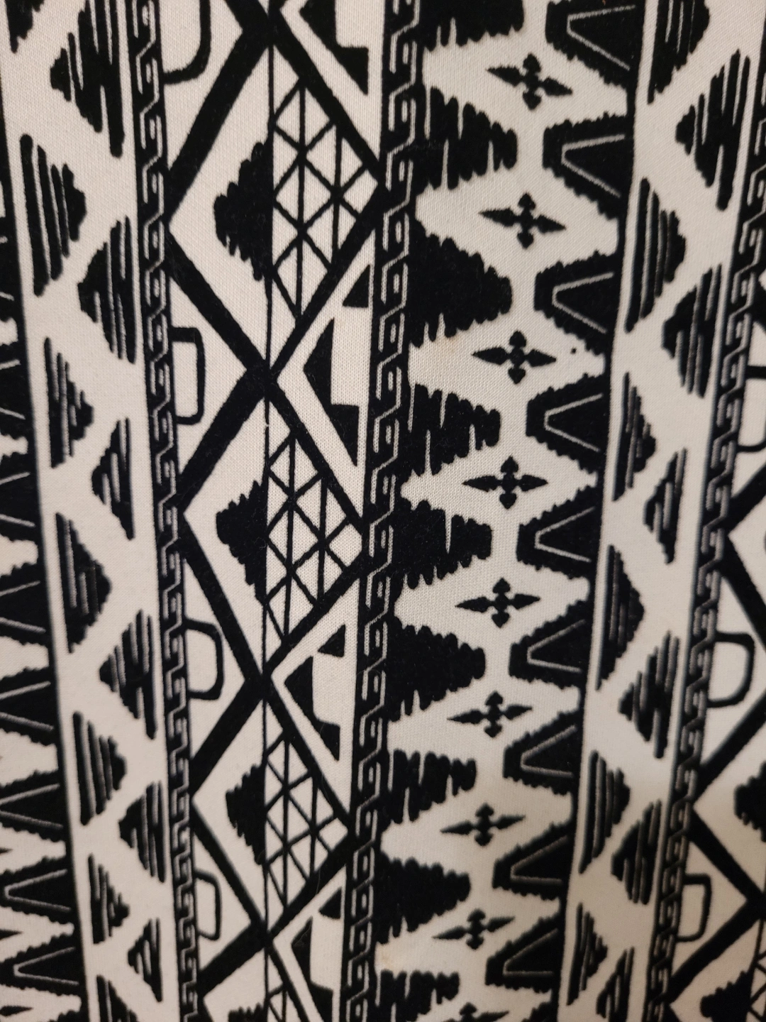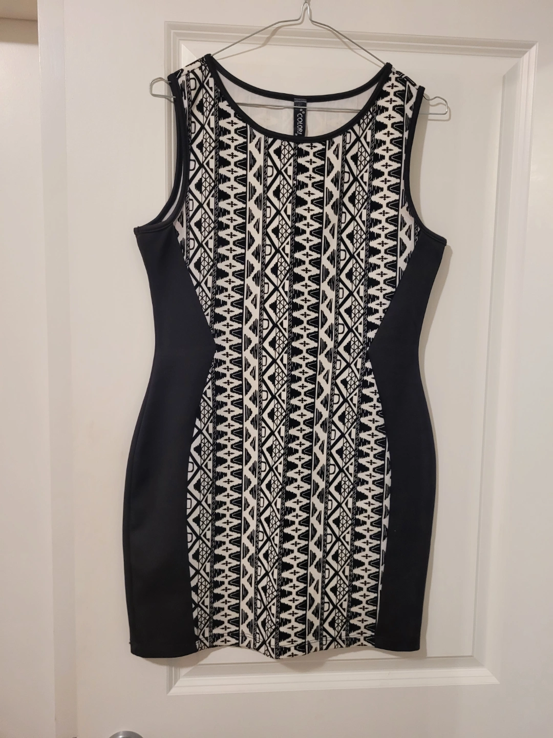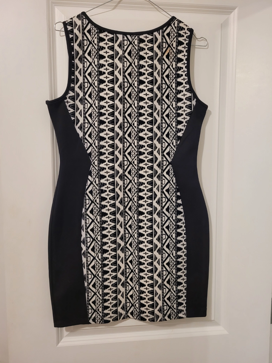 Sleeveless mini dress. Black and white geometric print. Form-fitting. Suitable for various occasions.