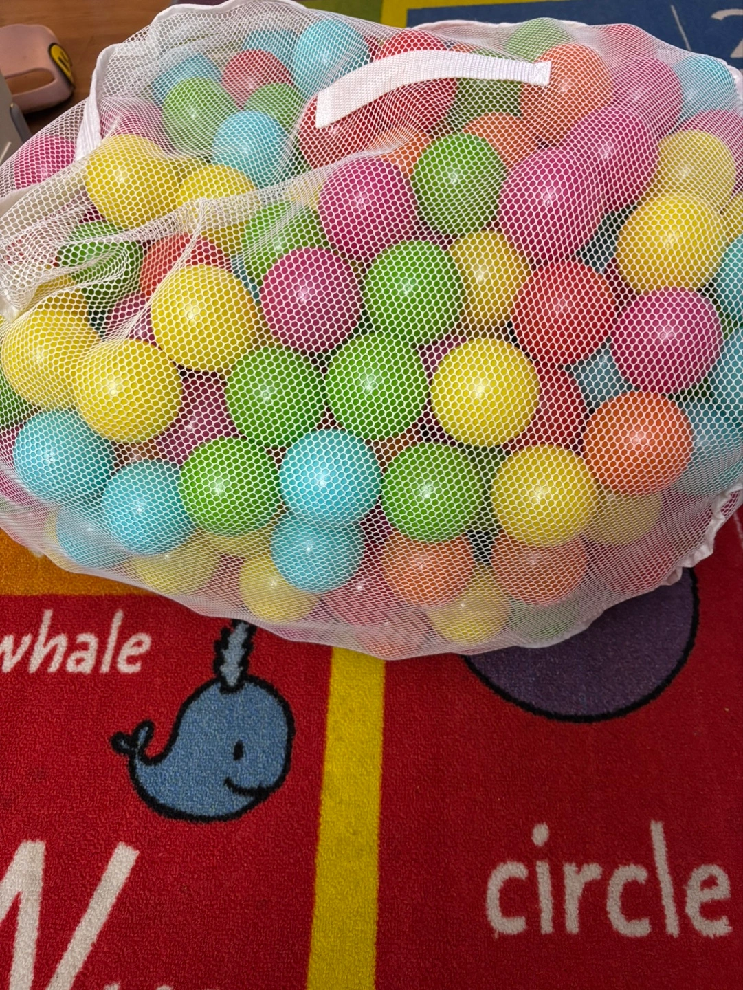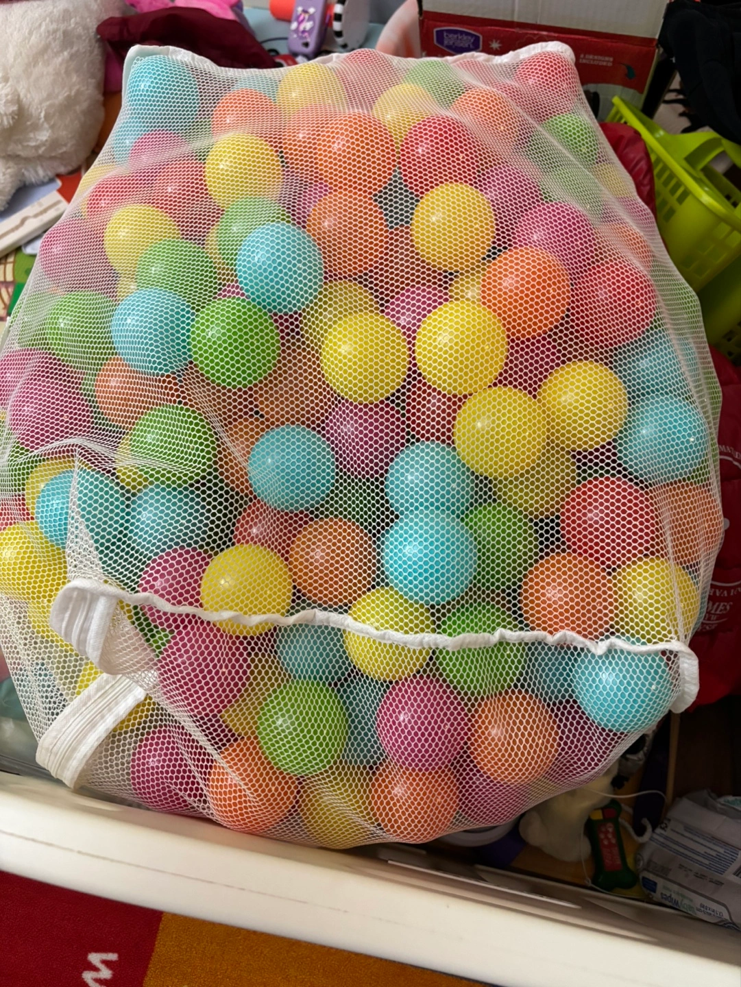 A mesh bag filled with many colorful plastic balls. Perfect for a ball pit or sensory play. Various bright colors. Great for toddlers and young children.