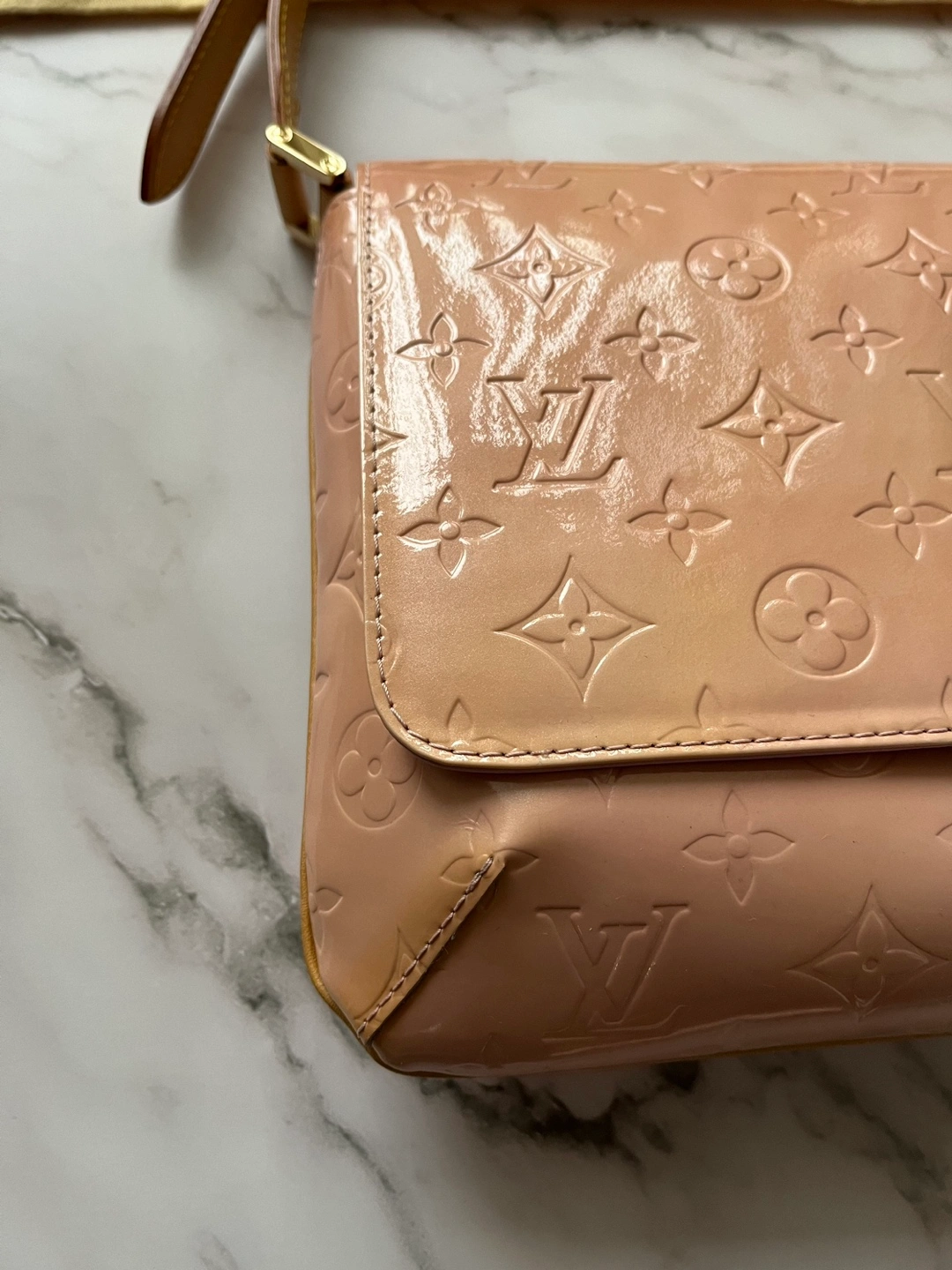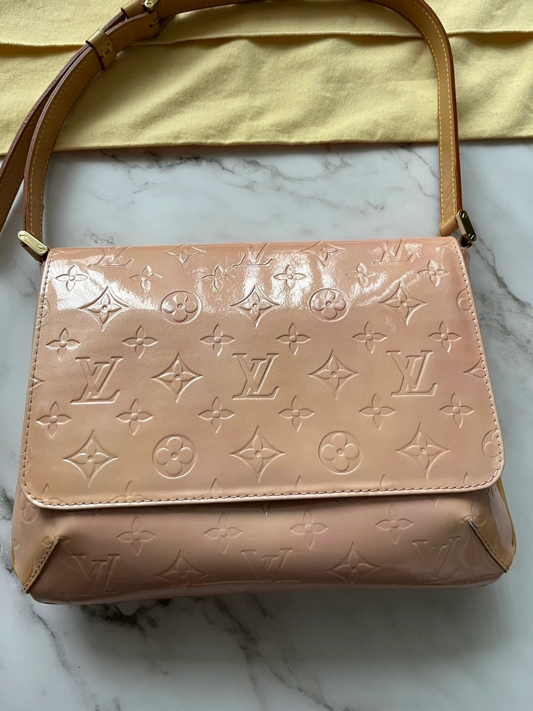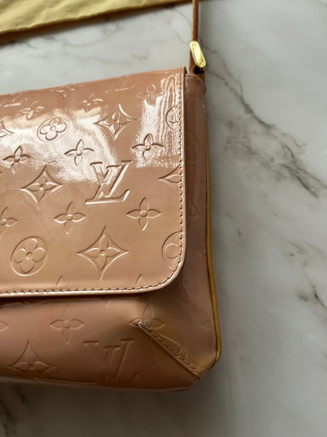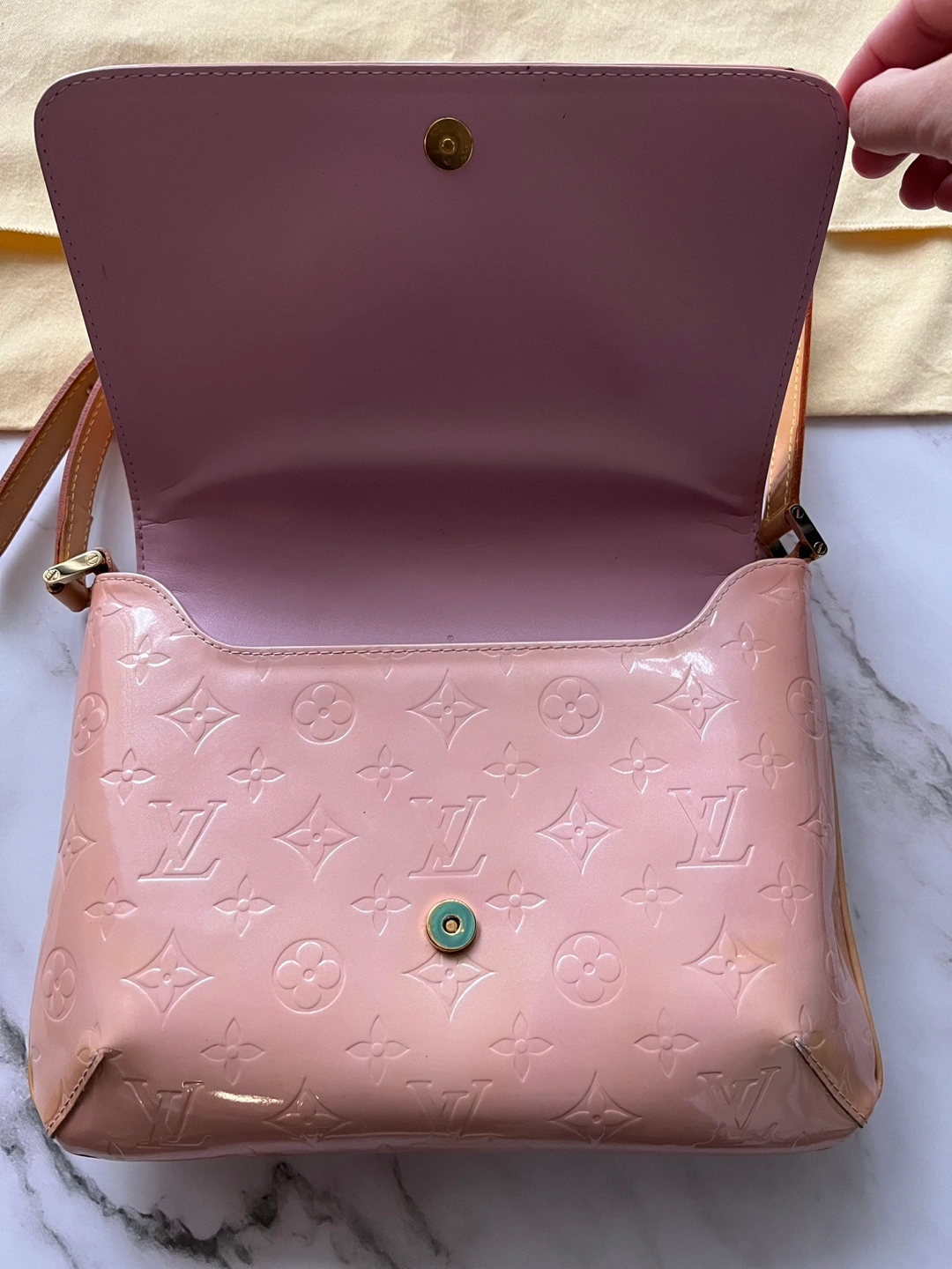 This Louis Vuitton Pink Vernis Leather Thompson Street hand bag is in great condition, but as you may know, light colored Vernis can start to change color over time even when stored well so this has a tinge of yellow to it.