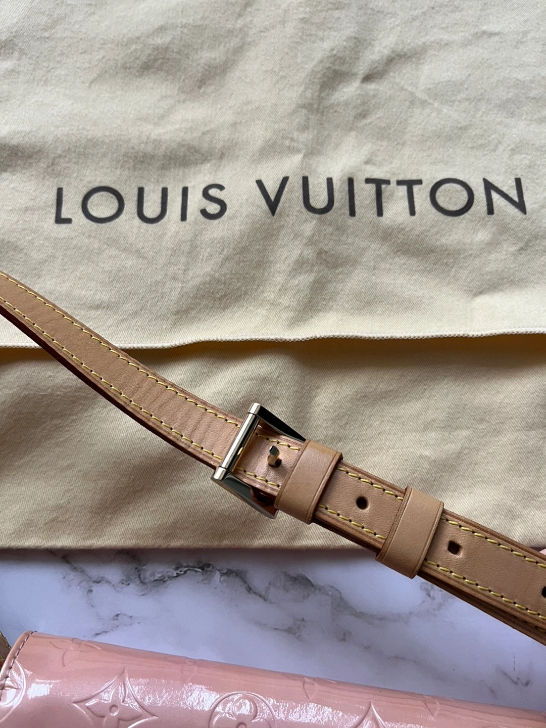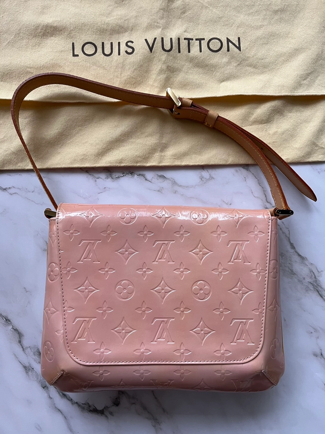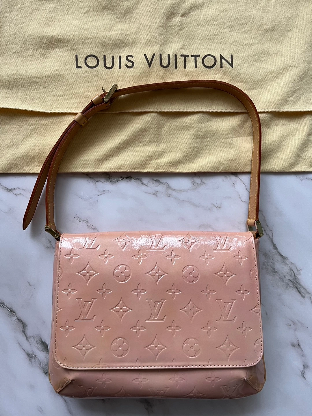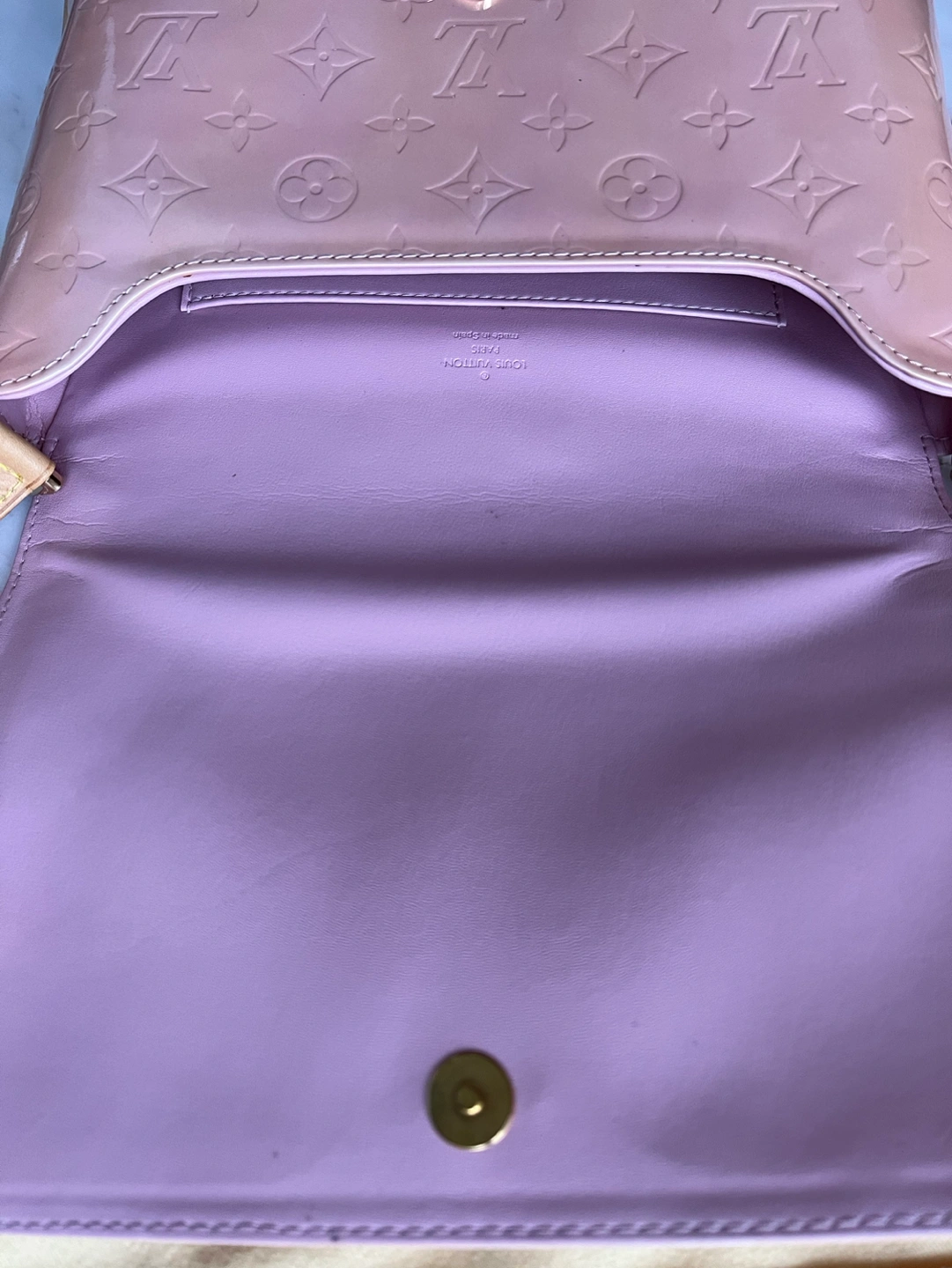 This Louis Vuitton Pink Vernis Leather Thompson Street hand bag is in great condition, but as you may know, light colored Vernis can start to change color over time even when stored well so this has a tinge of yellow to it.