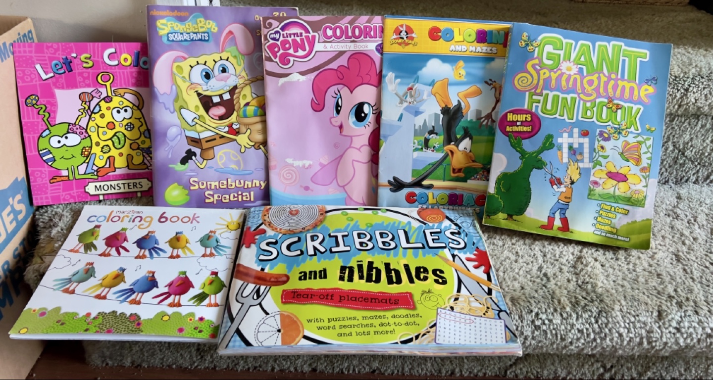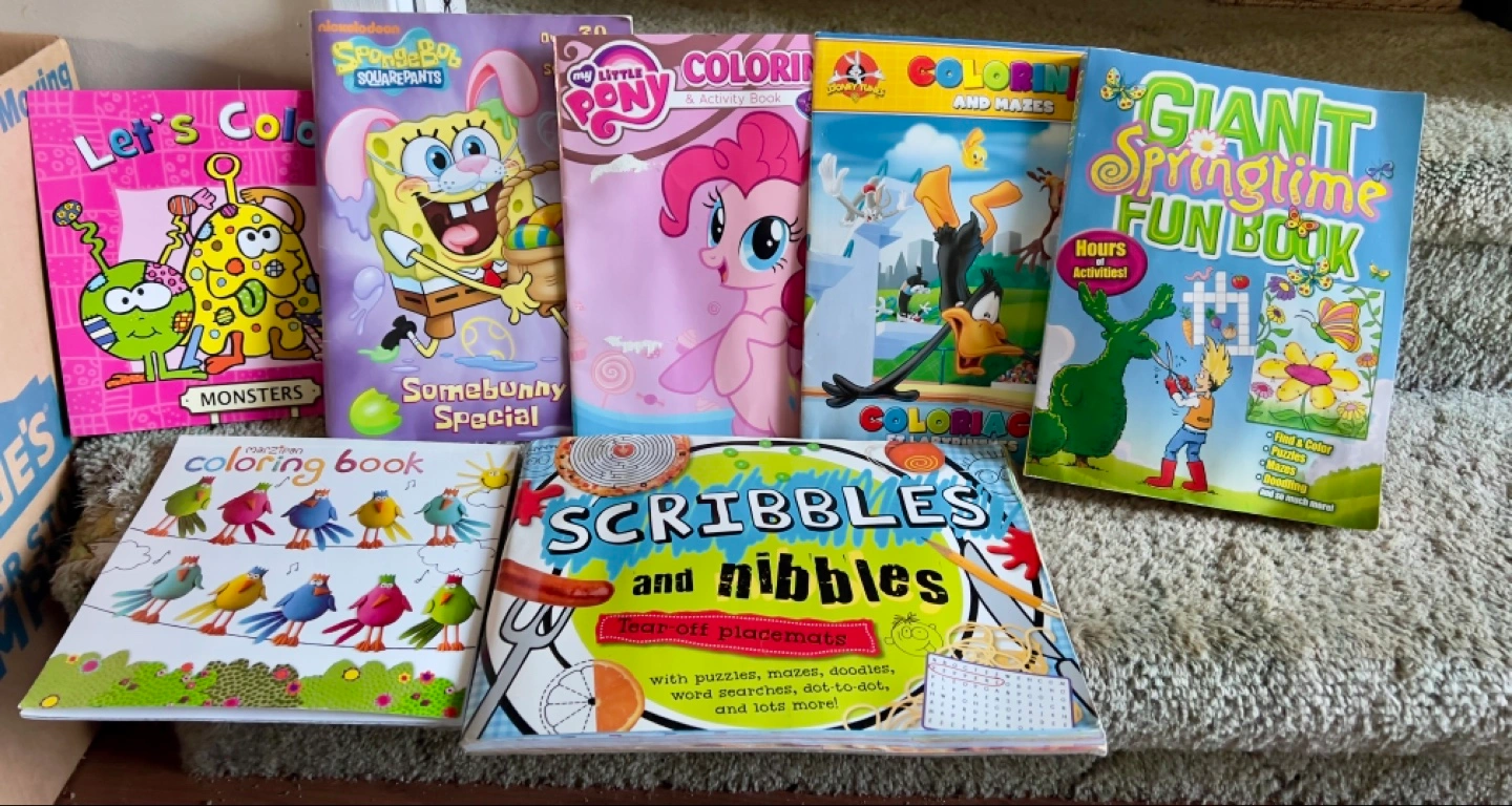 Collection of colouring and activity books. Features popular characters like SpongeBob, My Little Pony, and Daffy Duck. Includes mazes, puzzles, and other activities. On front step hanging off mailbox if add up they are still there 🥕
