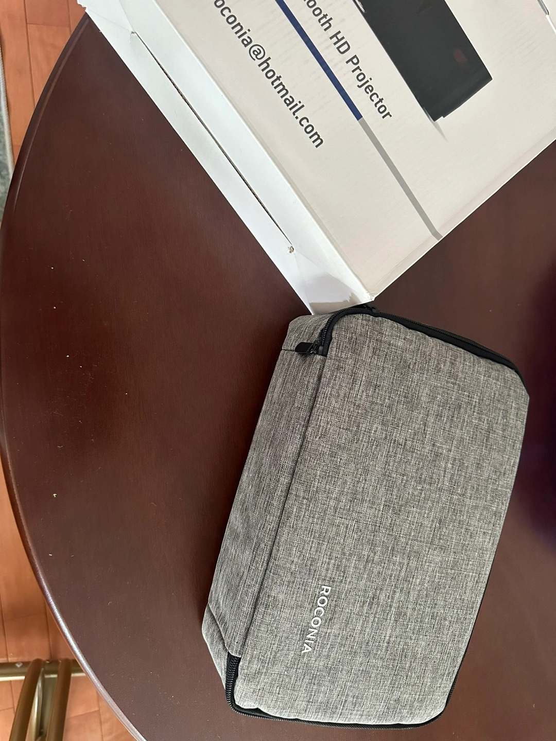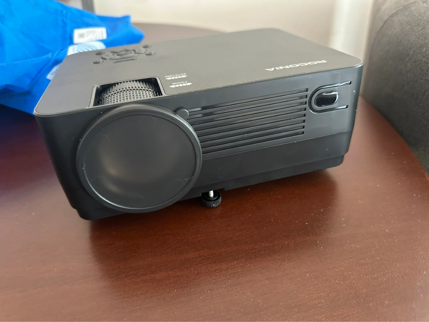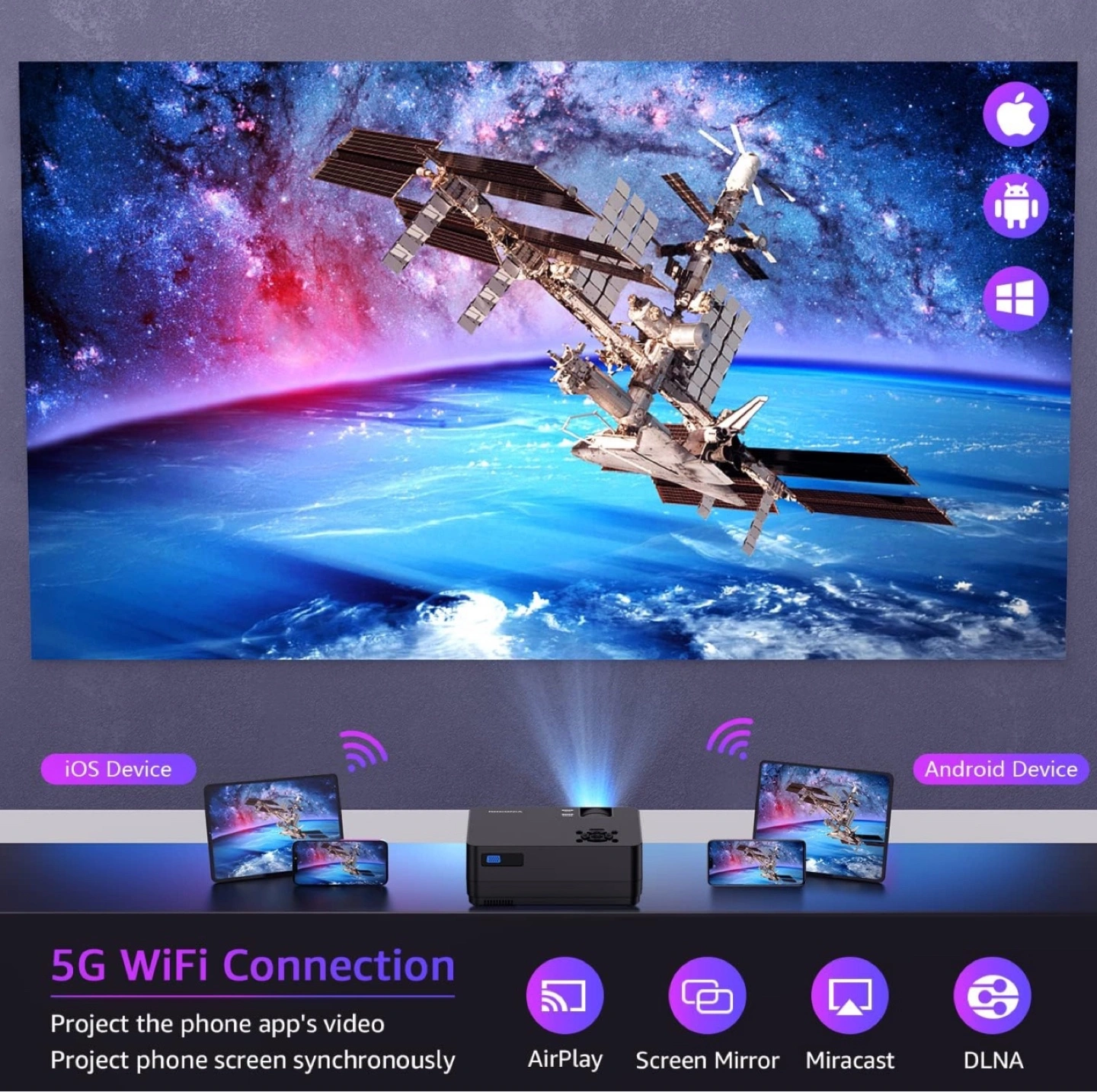 Portable projector, 1080p HD, includes screen and carrying case. 5G WiFi, Bluetooth connectivity. Works with Netflix, Prime Video, YouTube, and more. Includes remote and cables.