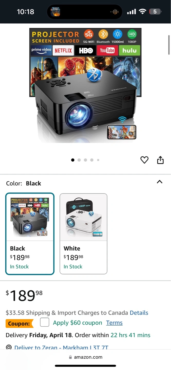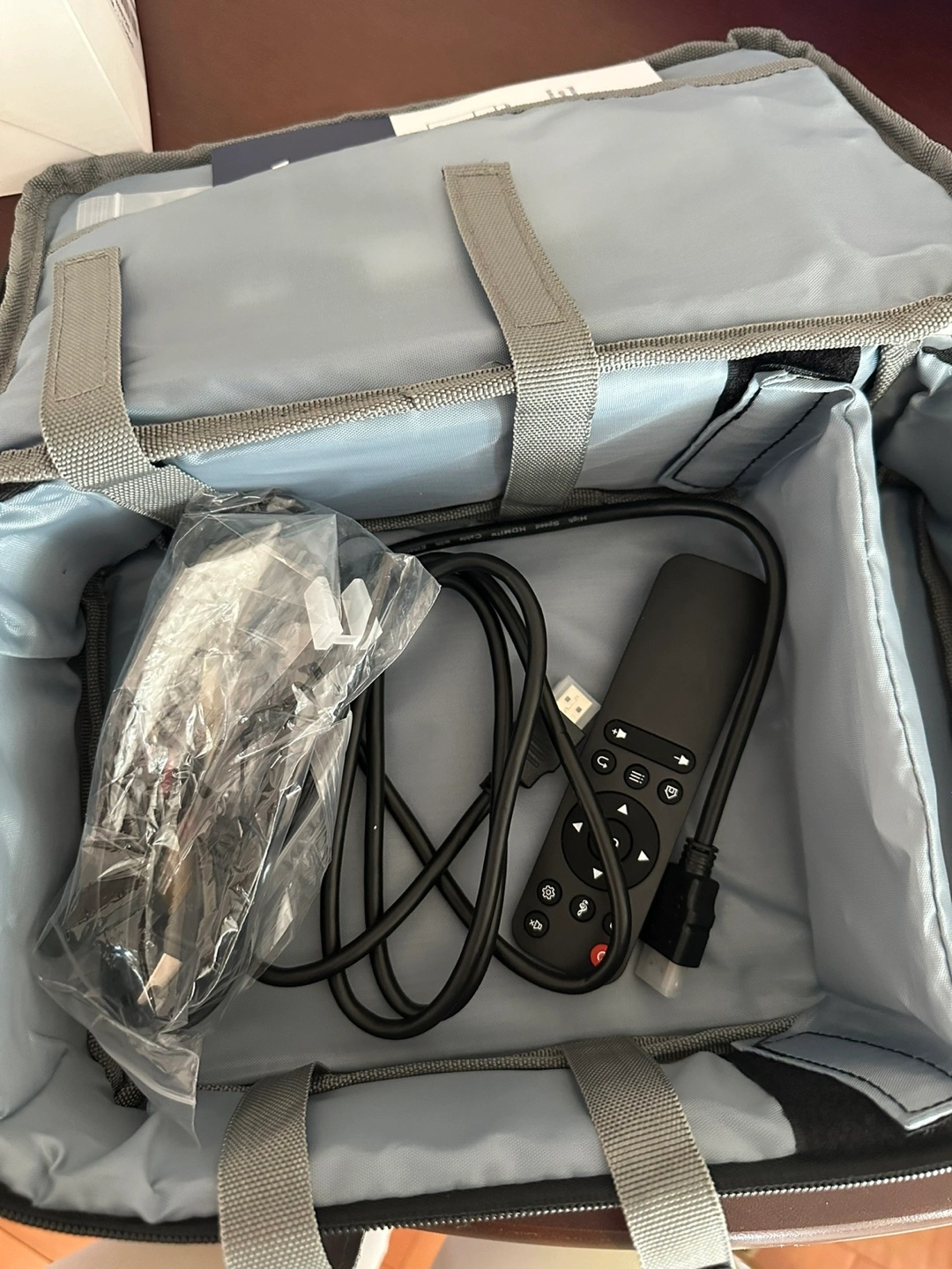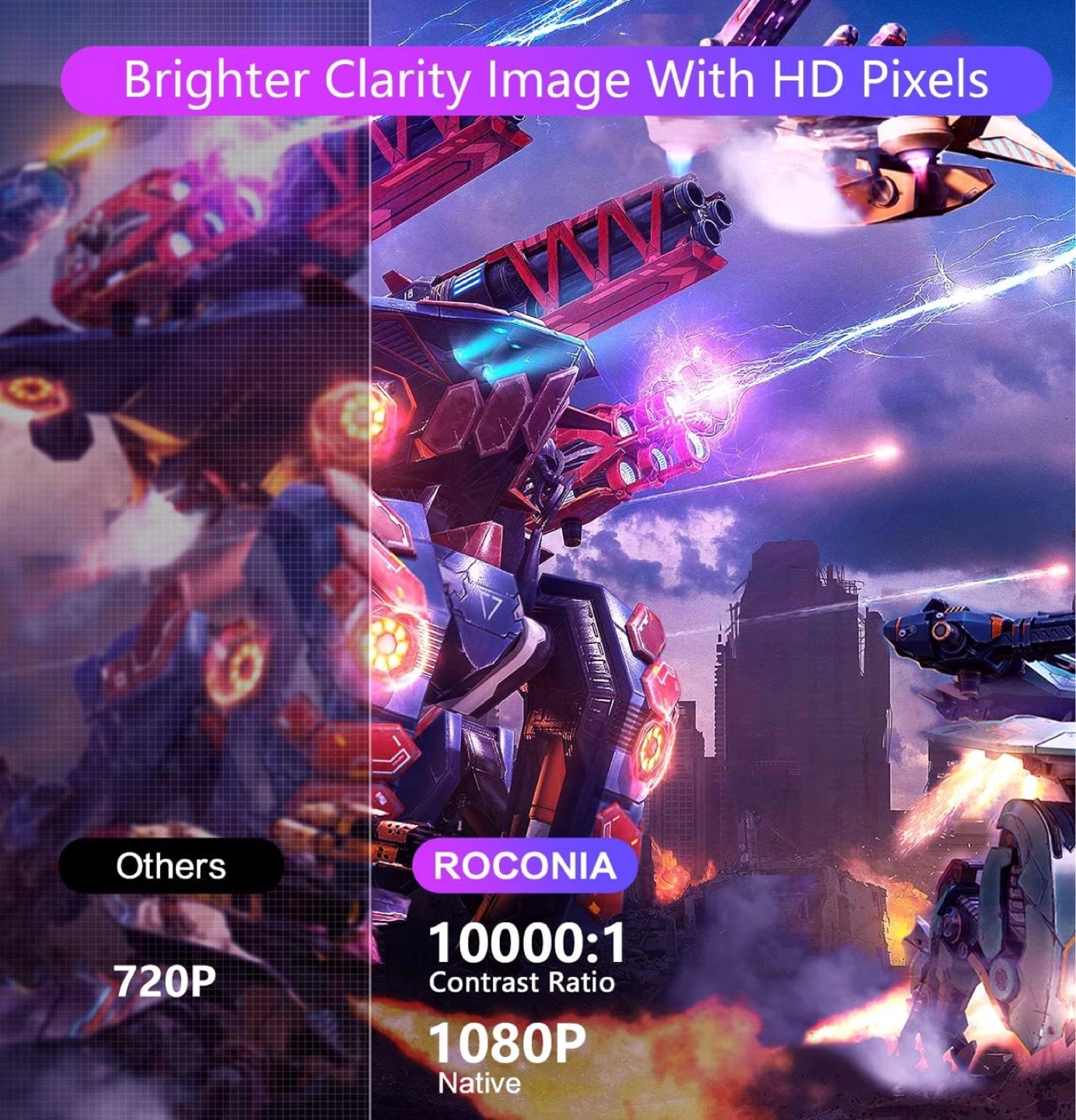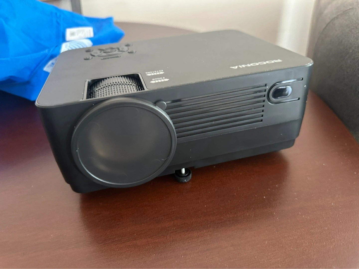 Portable projector, 1080p HD, includes screen and carrying case. 5G WiFi, Bluetooth connectivity. Works with Netflix, Prime Video, YouTube, and more. Includes remote and cables.
