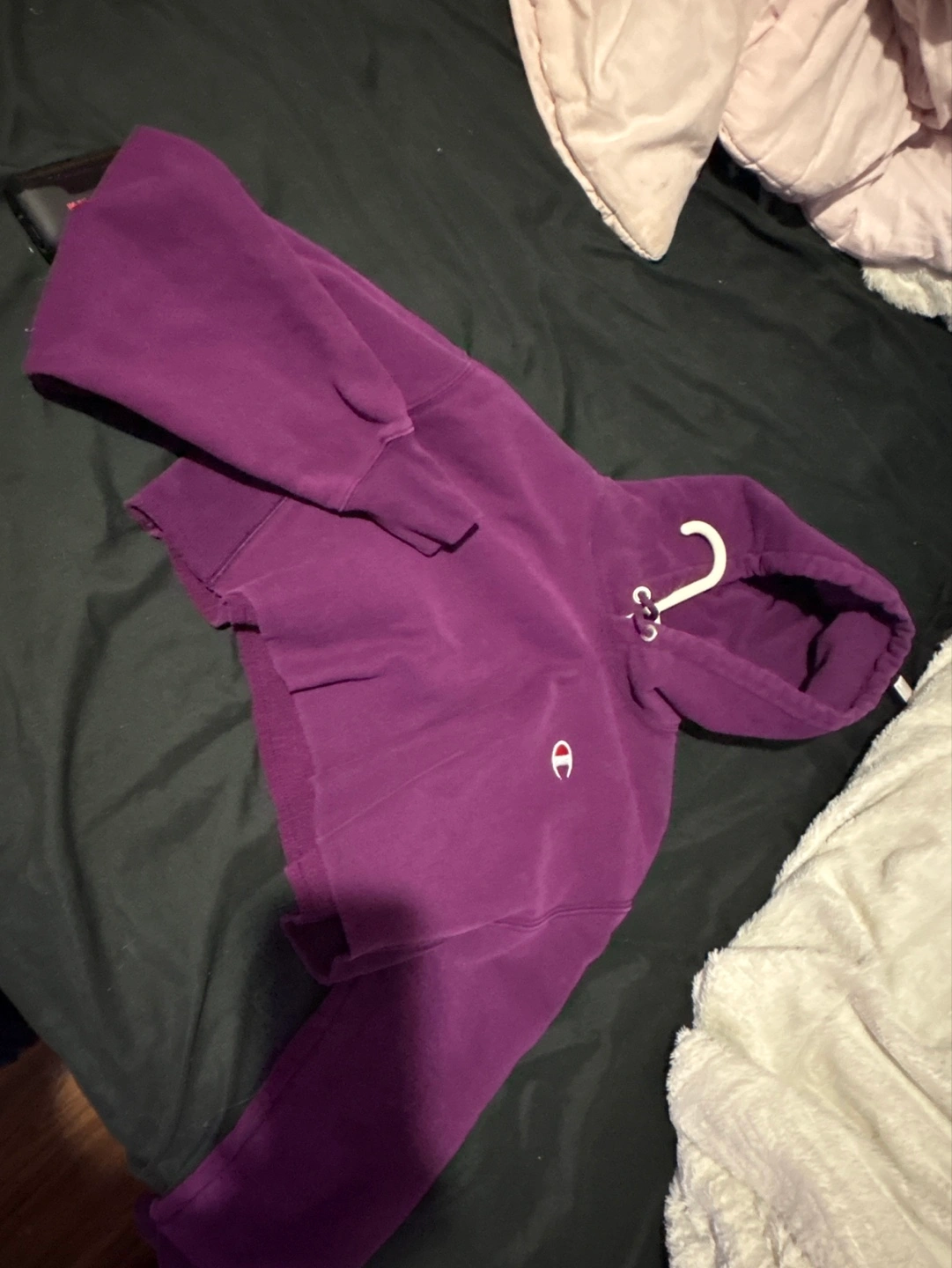 Women's cropped Champion hoodie. Purple colour. Small Champion logo. Drawstring hood.