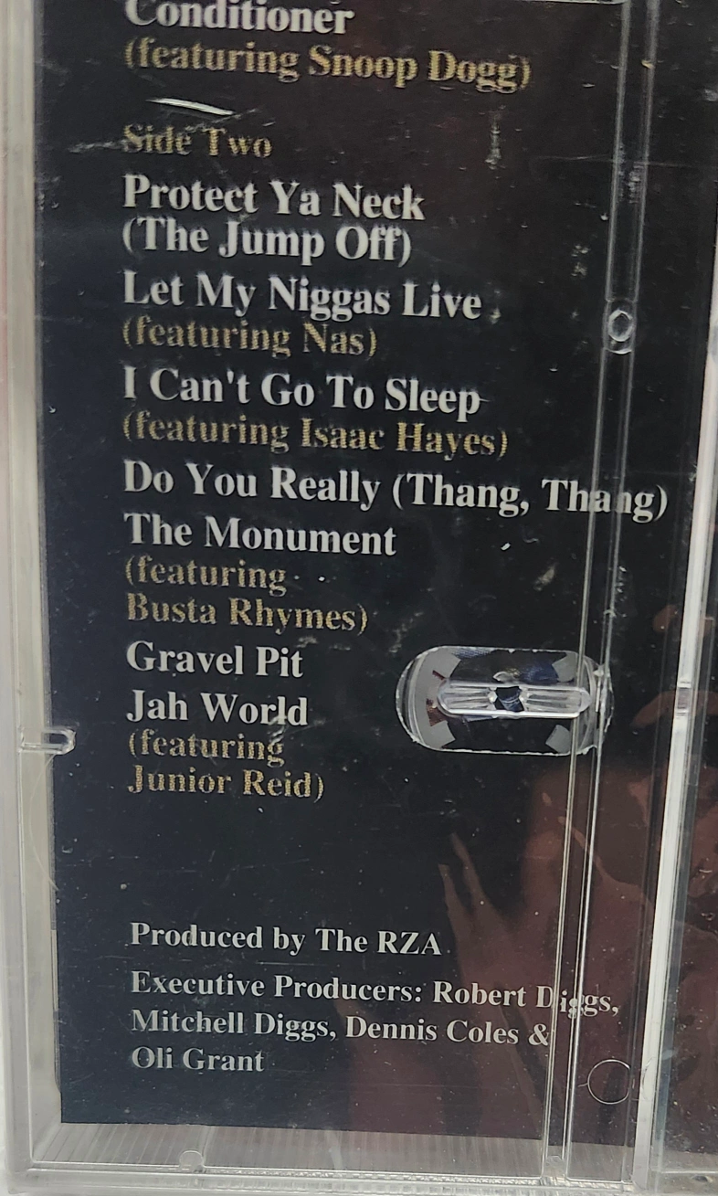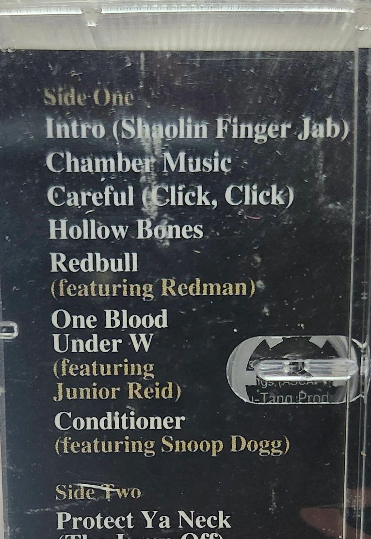 Sealed to ensure pristine audio quality, the cassette features the unadulterated energy of the legendary hip-hop group. The inlay is also in mint shape, complemented by the original hype sticker that adds to the item's authenticity and collectability. With English lyrics that resonate and beats that stand the test of time, this album is a must-have for any Wu-Tang Clan admirer or cassette tape collector.