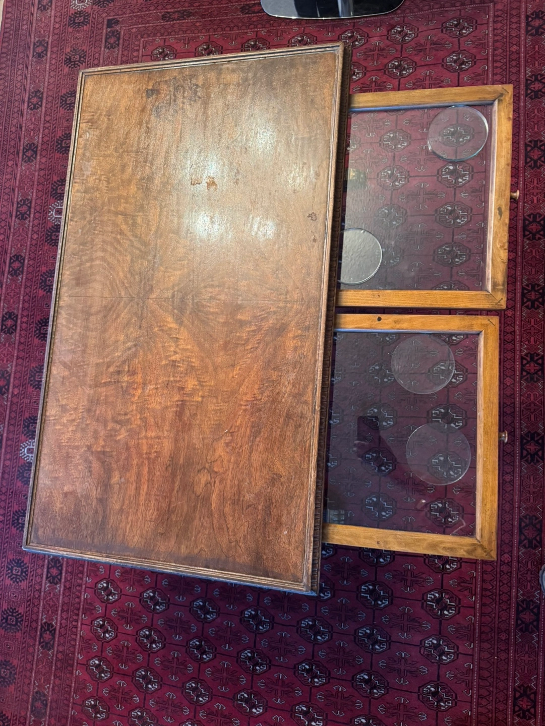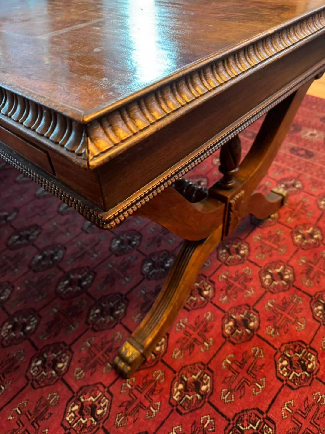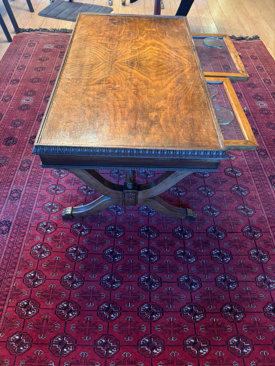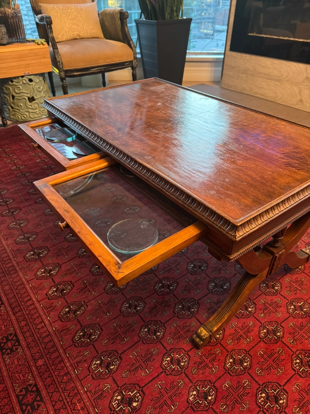 Beautiful antique coffee table. Features a rich, dark wood finish. Includes two slide-out drawers with glass tops. Ornate detailing on the frame and legs. Great for a living room or den.