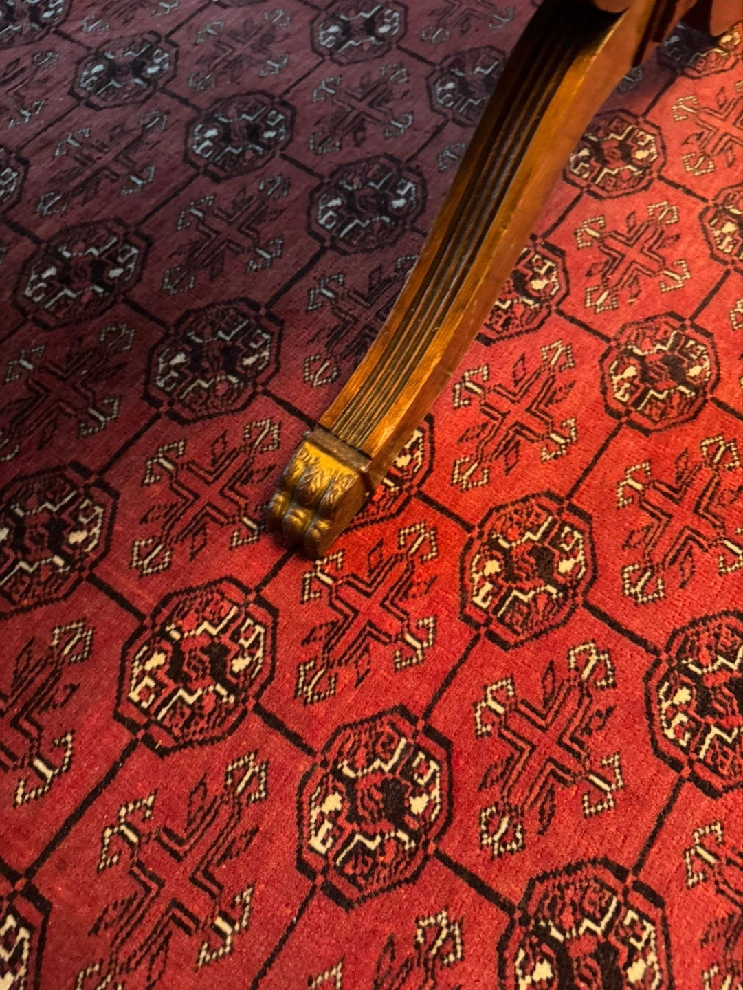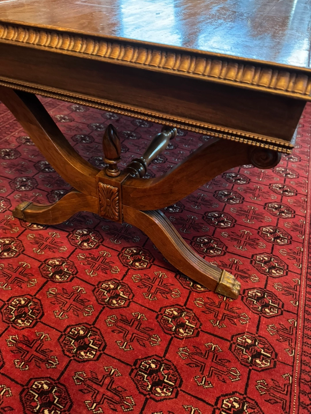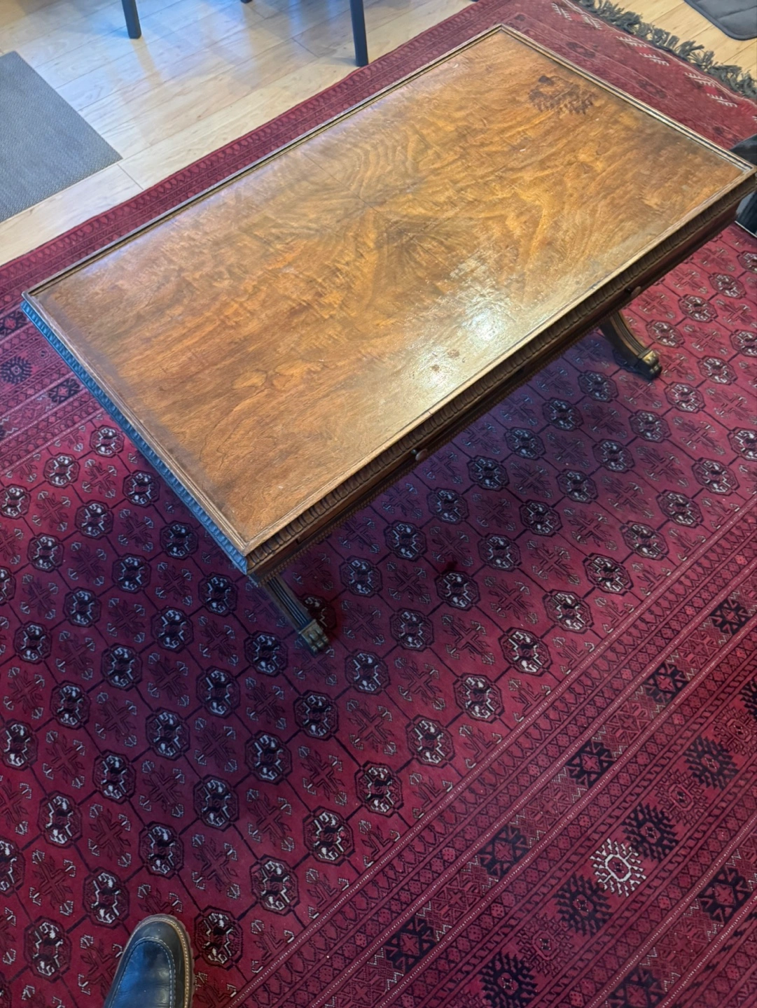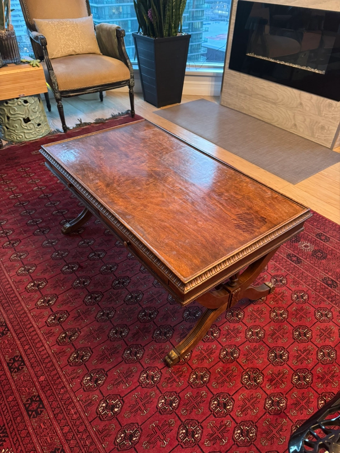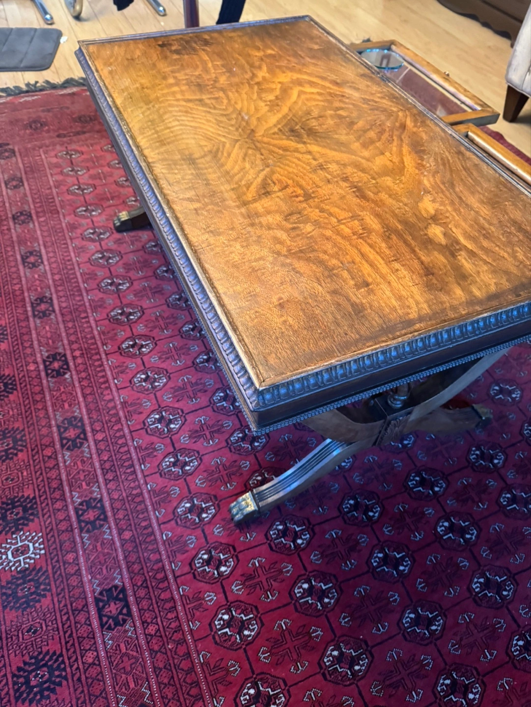 Beautiful antique coffee table. Features a rich, dark wood finish. Includes two slide-out drawers with glass tops. Ornate detailing on the frame and legs. Great for a living room or den.