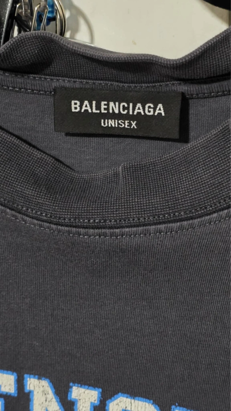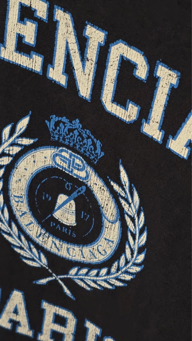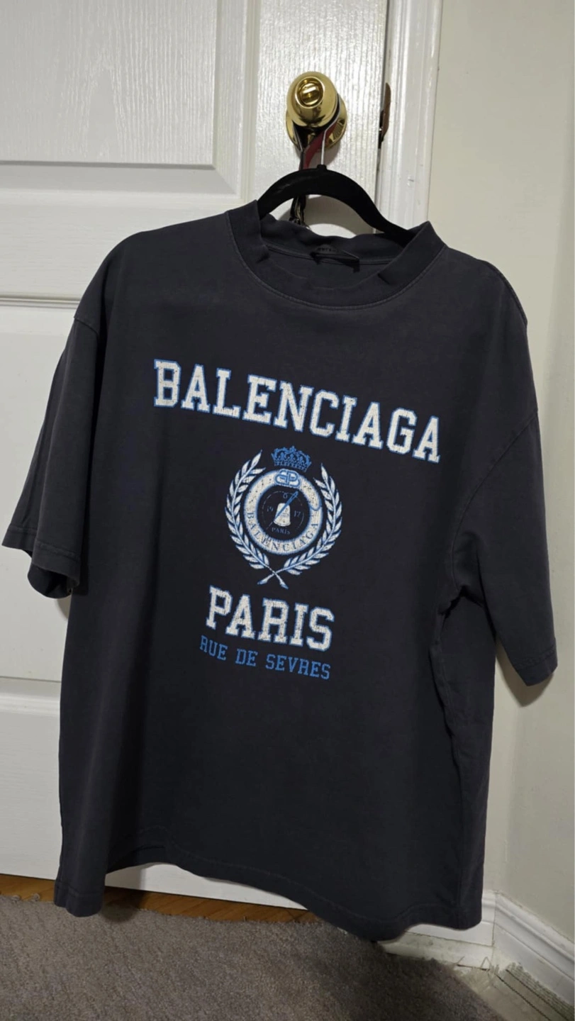 Authentic! Men's medium Balenciaga t-shirt. Ocean blue colour. Features a college-style crest graphic. Made in Portugal. Shows some wear.