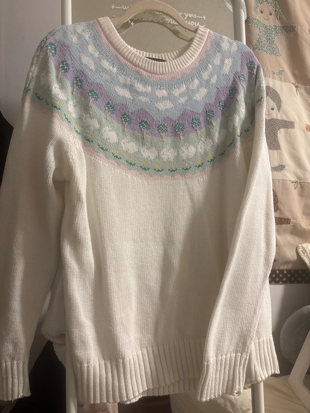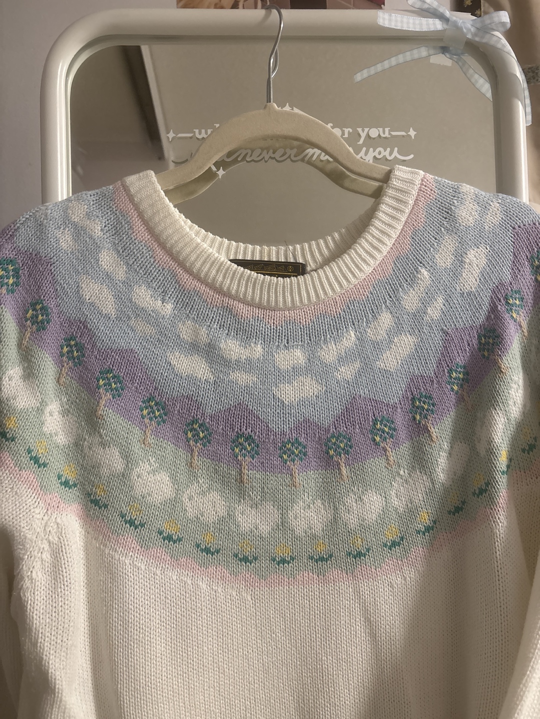 Adorable pastel-coloured sweater featuring a landscape design with clouds, trees, bunnies, and flowers! Size L