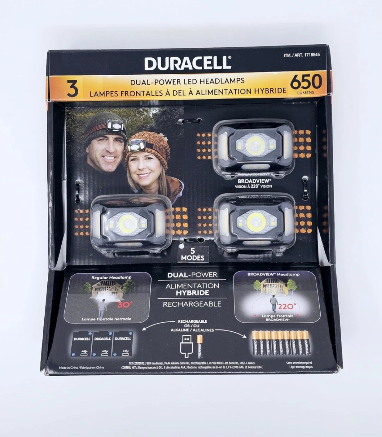 Light up the night with the Duracell Dual Power LED Headlamp 3-pack - your ultimate source of reliable and powerful light. Boasting an impressive 650 lumens, these headlamps provide a wide 220° beam area, ensuring that you never miss a detail.