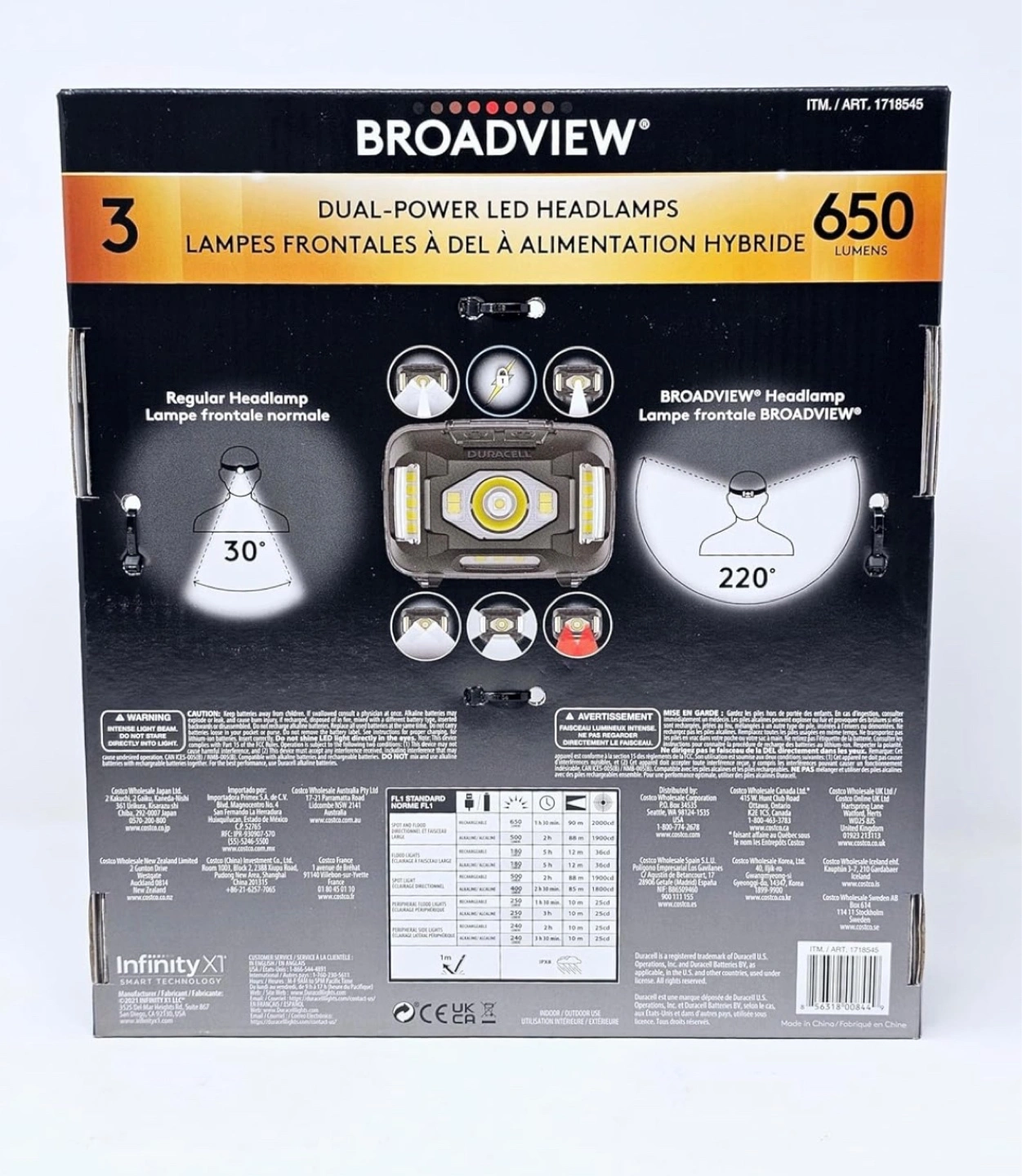 Illuminate your path with this brand new Duracell Dual-Power LED Headlamps, 650 Lumens, featuring broad view and regular modes. These versatile headlamps come in a convenient 3-pack, perfect for camping, hiking, or any nighttime adventure.