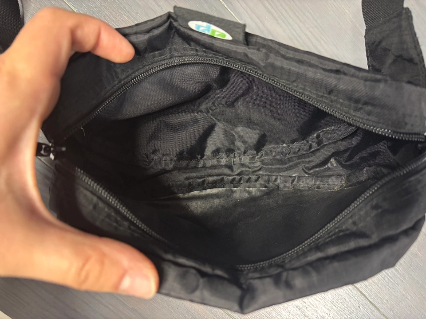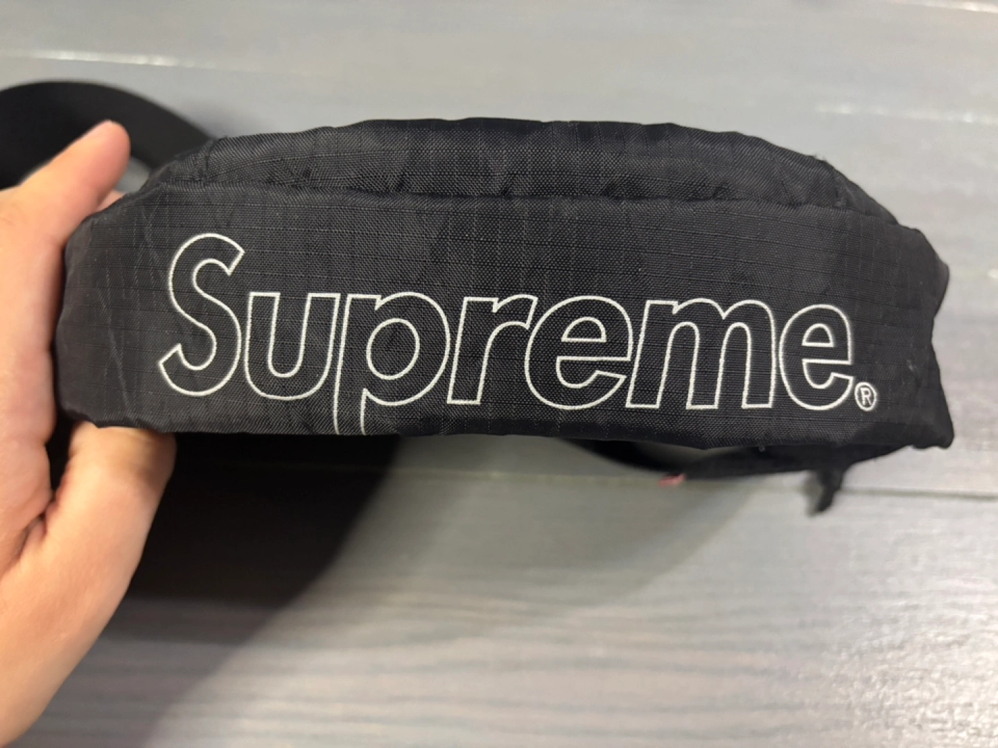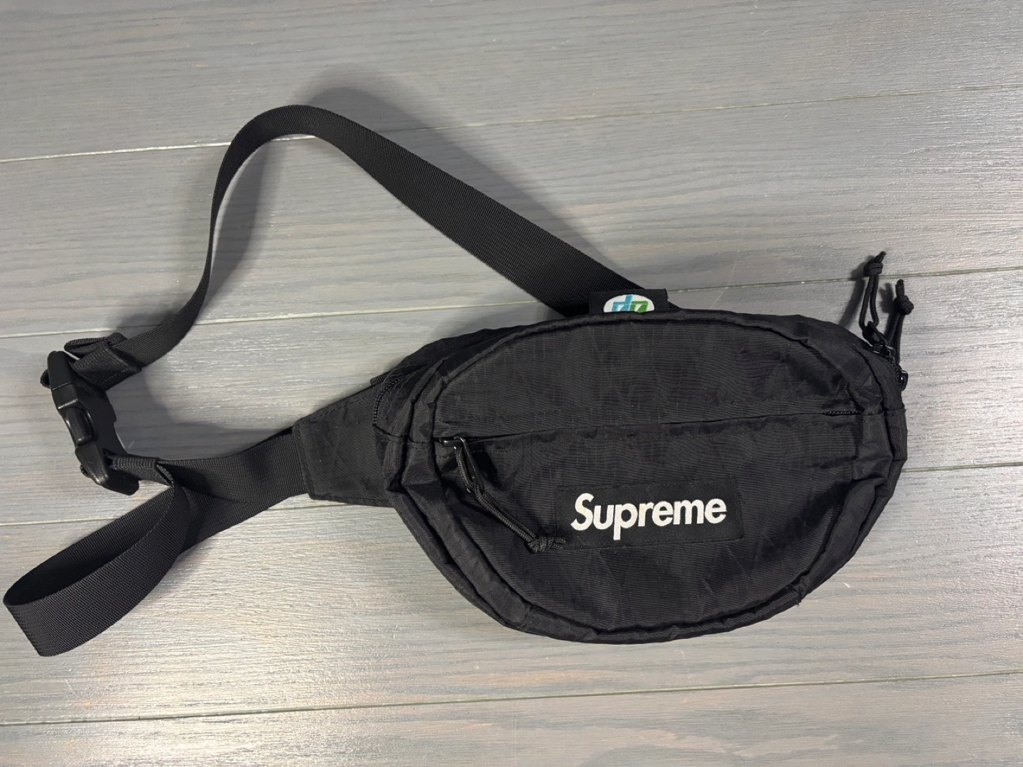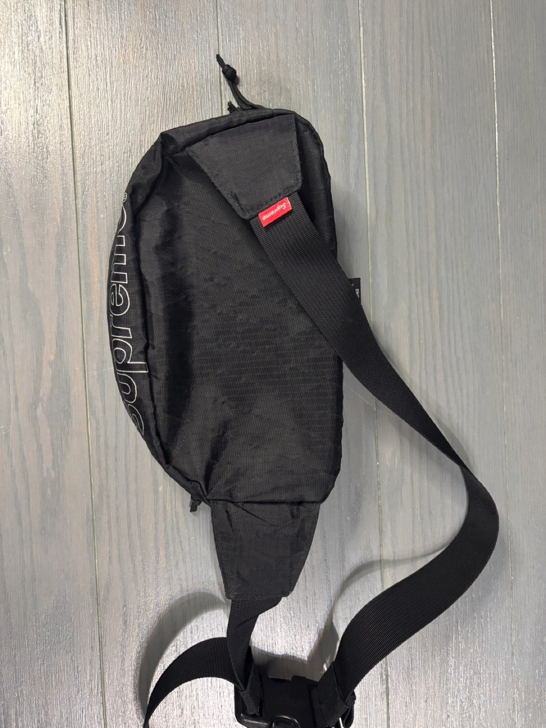 Black nylon waist bag. Features adjustable strap and zipper closure. Supreme branding visible. Small and compact.