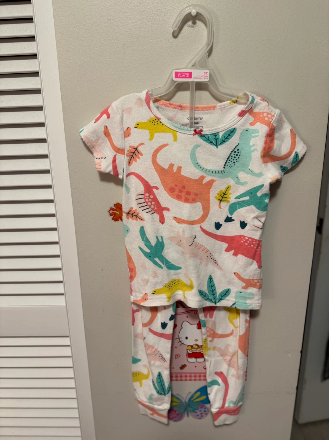 Adorable Carter's pajama set. Features a short-sleeved top and coordinating pants. Dinosaur print.