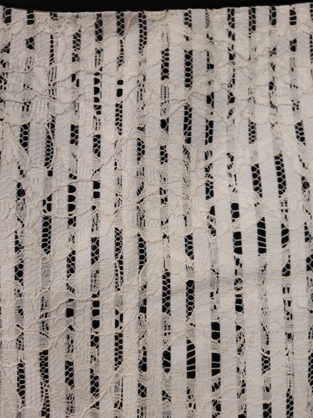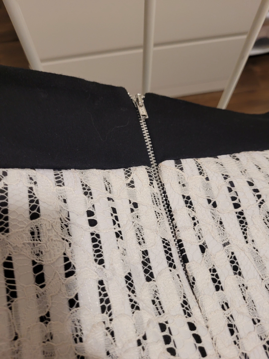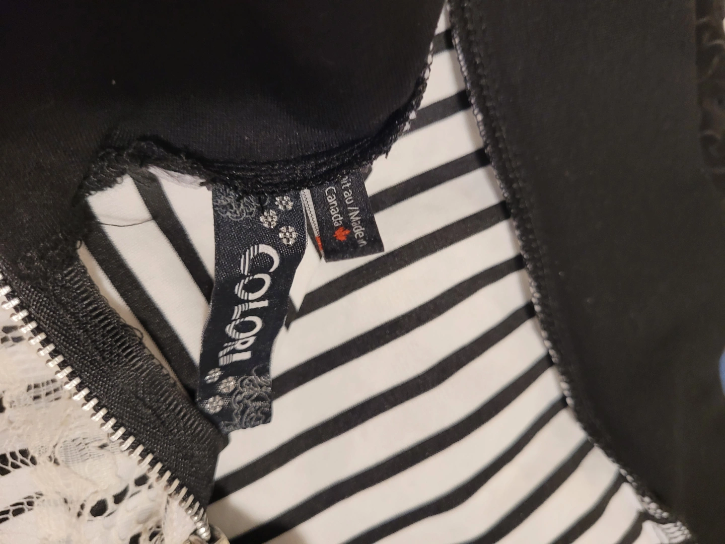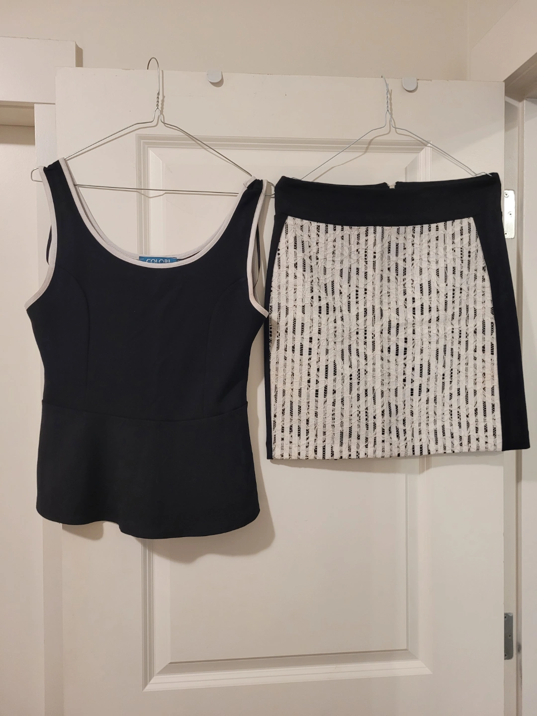 Matching black and white top and skirt set. Top features a scoop neck and fitted silhouette. Skirt is a mini with a black waistband and white lace overlay. Back zipper closure. Made in Canada.