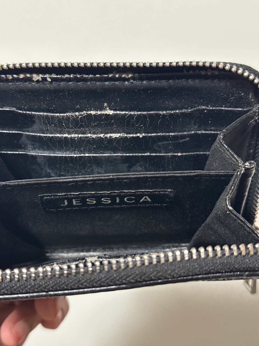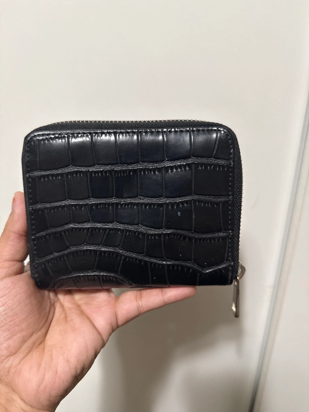 Small black wallet. Crocodile-embossed leather. Zip closure. Multiple card slots. Pre-owned.