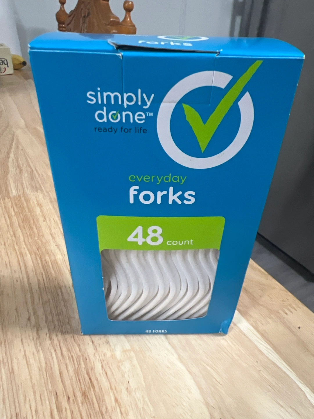 Box of 48 white plastic forks. Convenient for parties or everyday use. New, unopened box.