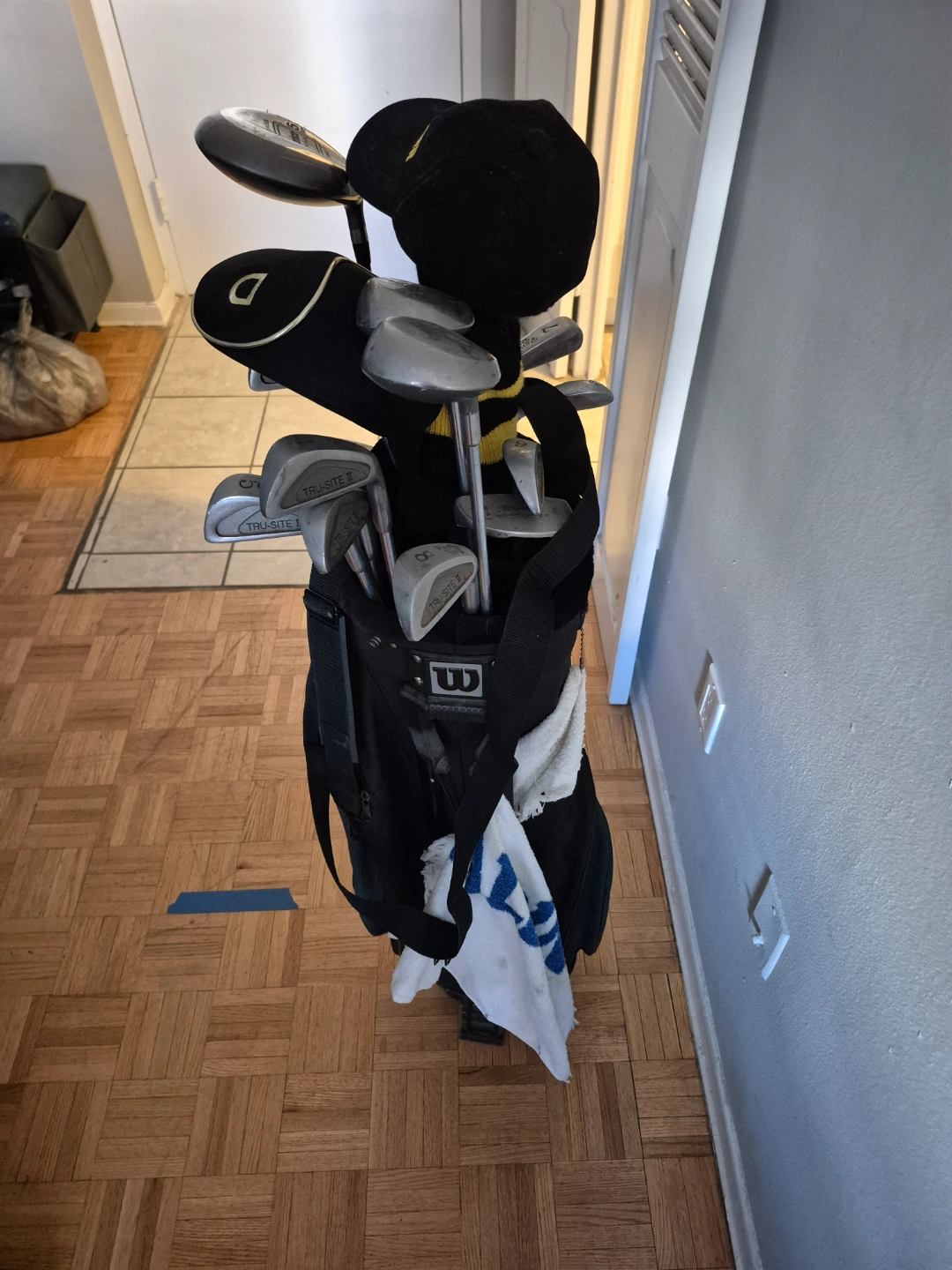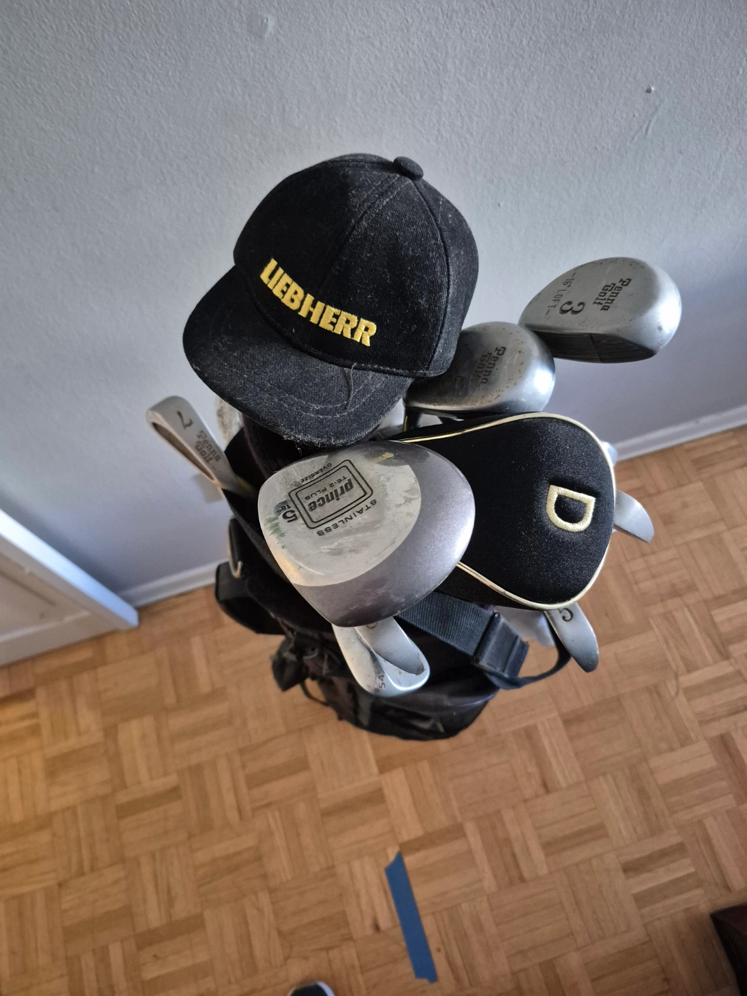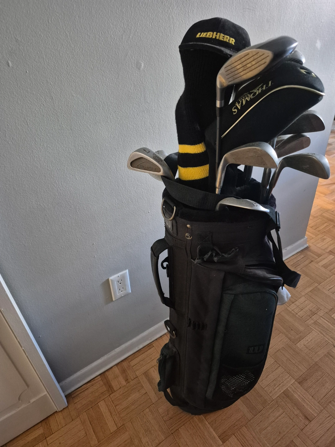 Complete golf club set in a black golf bag. Includes woods, irons, and a putter. Liebherr branded hat included. Thomas and Ram Tour Series clubs visible.