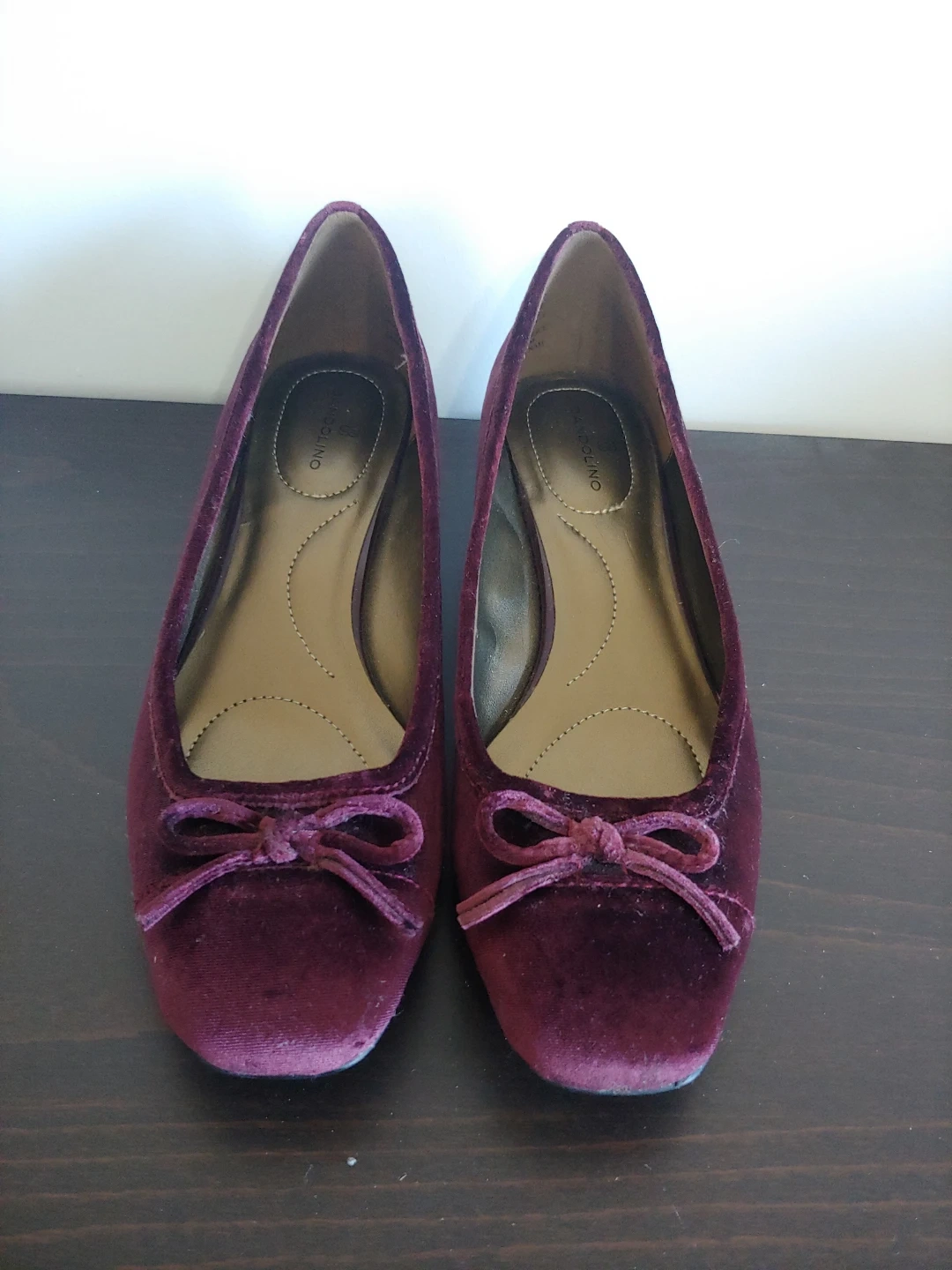 Dainty cranberry velvet shoes. Block heel. Cute Bow detail. Like new beautiful condition, the only reason I've got it so discounted is that it's not leather and the material not stretchy.