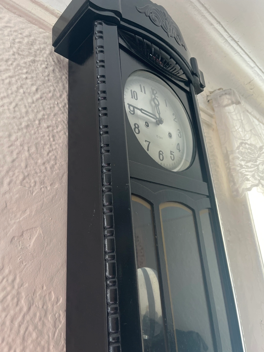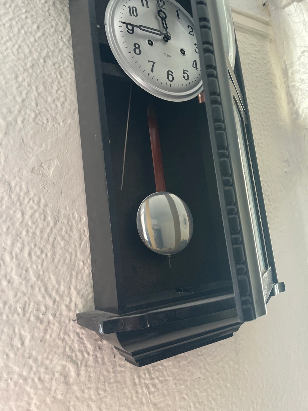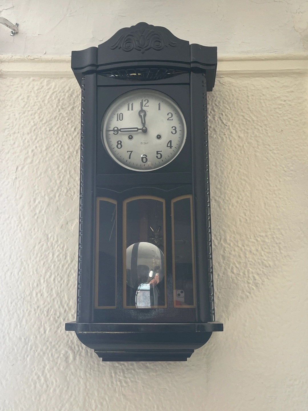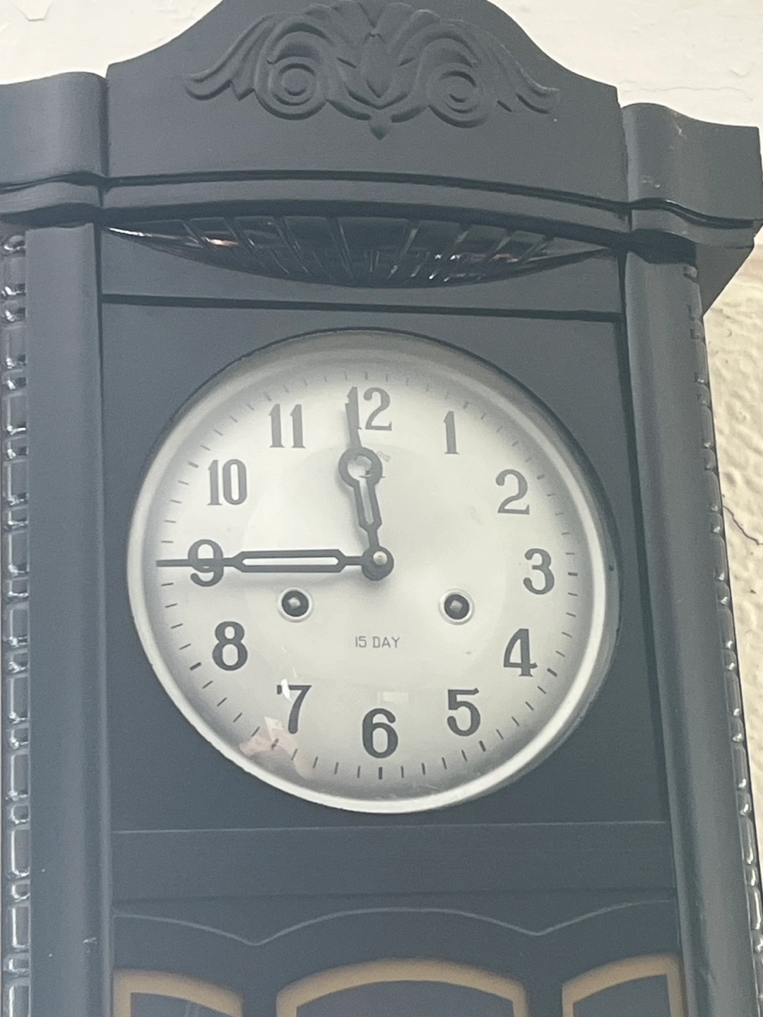 Antique pendulum clock. Black wooden casing. White face. 15-day movement. Glass front. Needs winding.