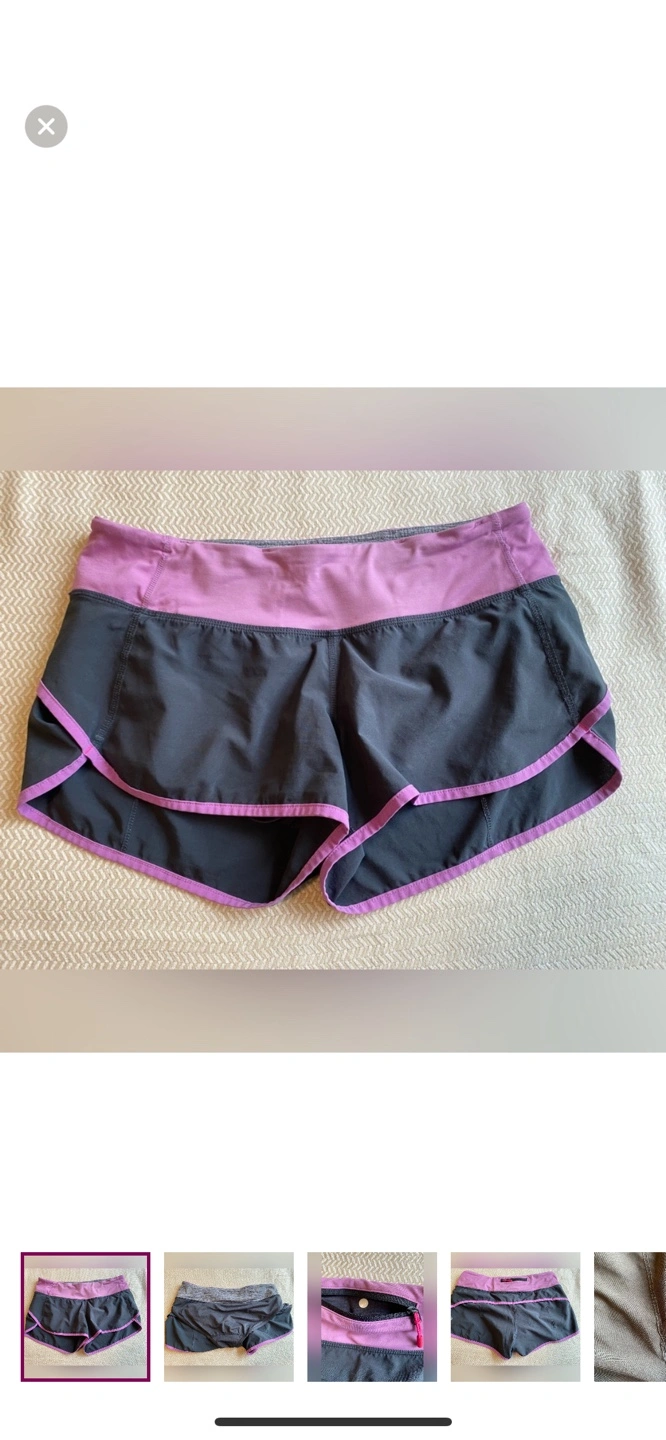 Women's athletic shorts. Black with purple waistband and trim. Size 4. Hidden pocket. Very good condition