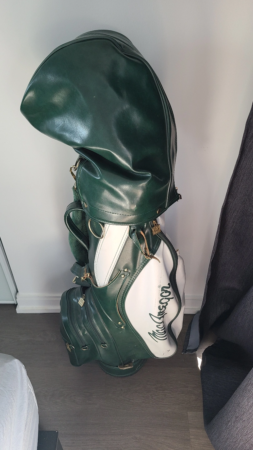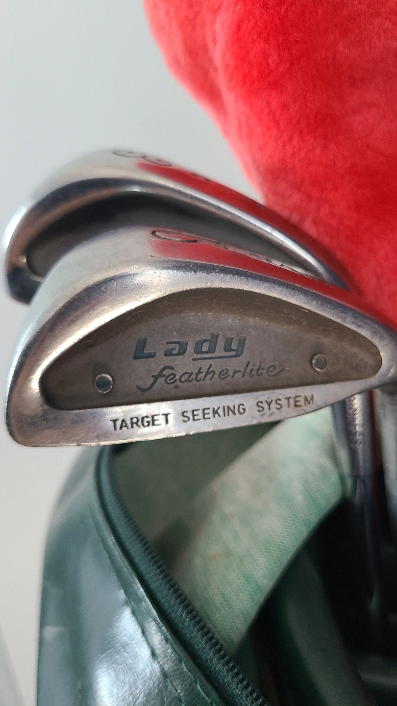 Women's vintage golf club set. Includes woods, irons, and a MacGregor golf bag. Clubs are Ram Lady Featherlite. Shaft savers included.