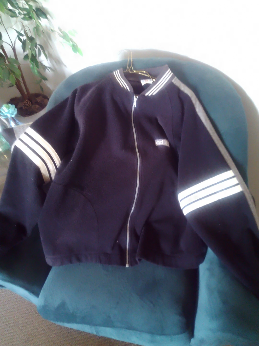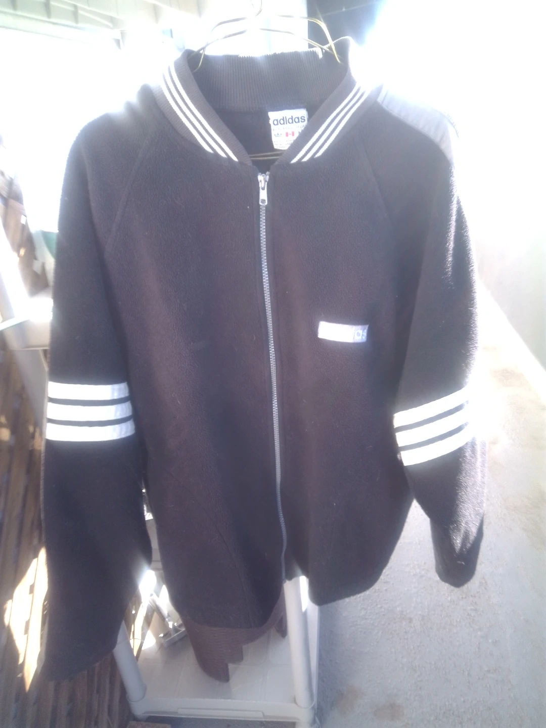Black fleece zip-up jacket. Features white and grey stripes on the sleeves and collar. Adidas branding on the chest. Long sleeves. Full zip closure.