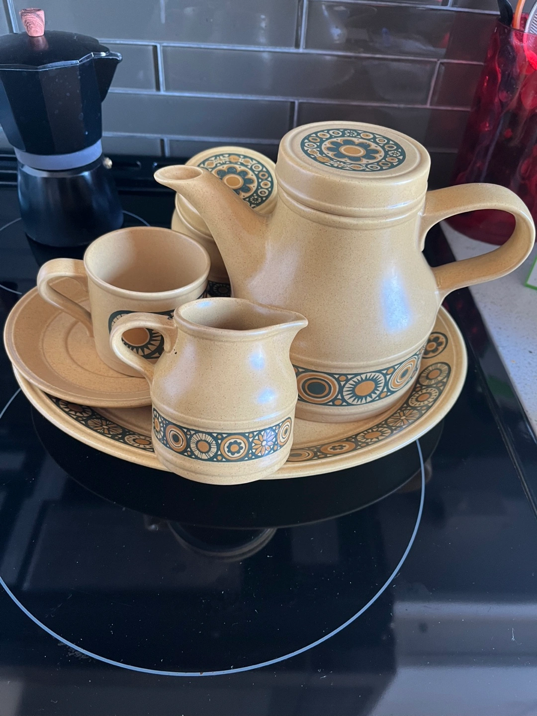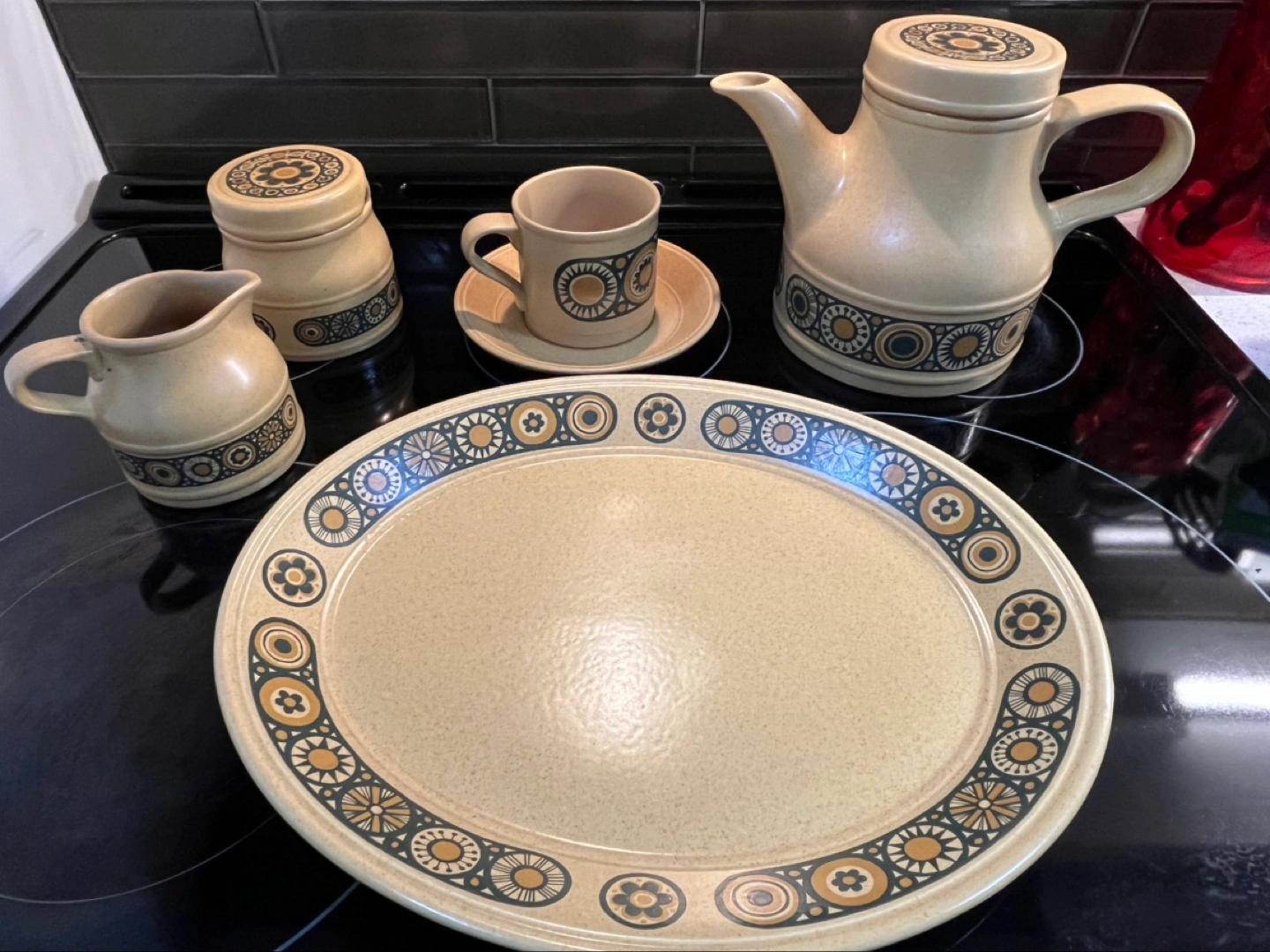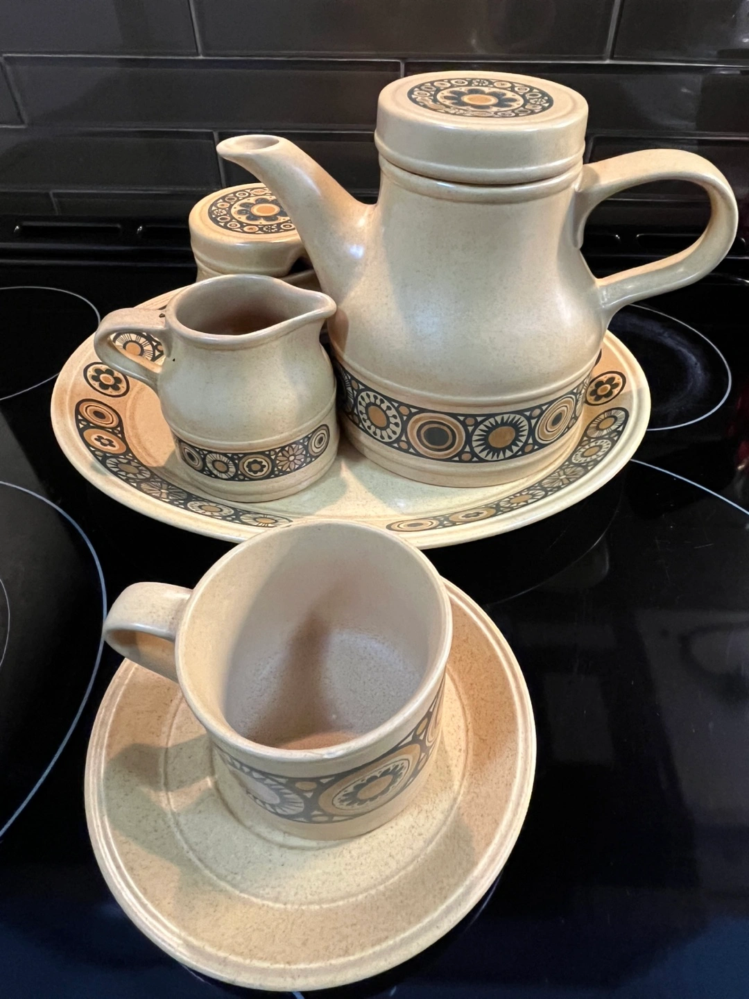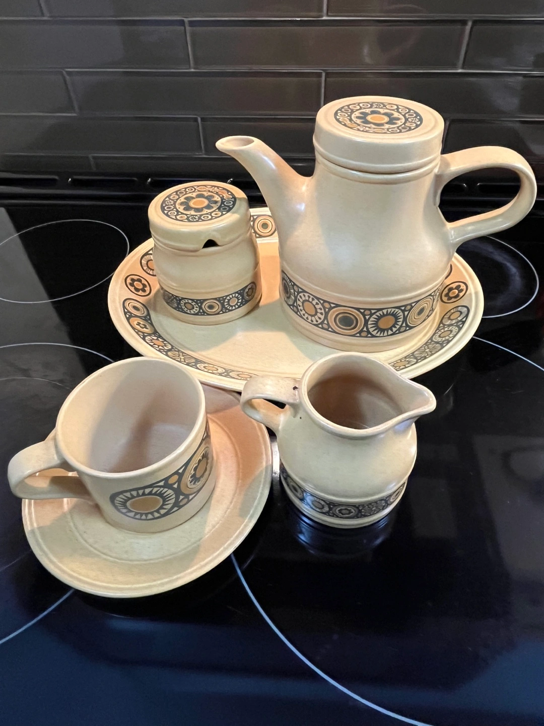 Beautiful vintage Kiln Craft Bacchus tea set. Includes teapot, milk jug, sugar bowl with lid, cup and saucer, and large serving platter. Made in England. Stoneware. Retro design. From 1970s. No chips or