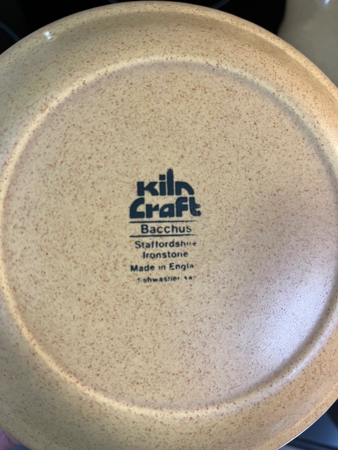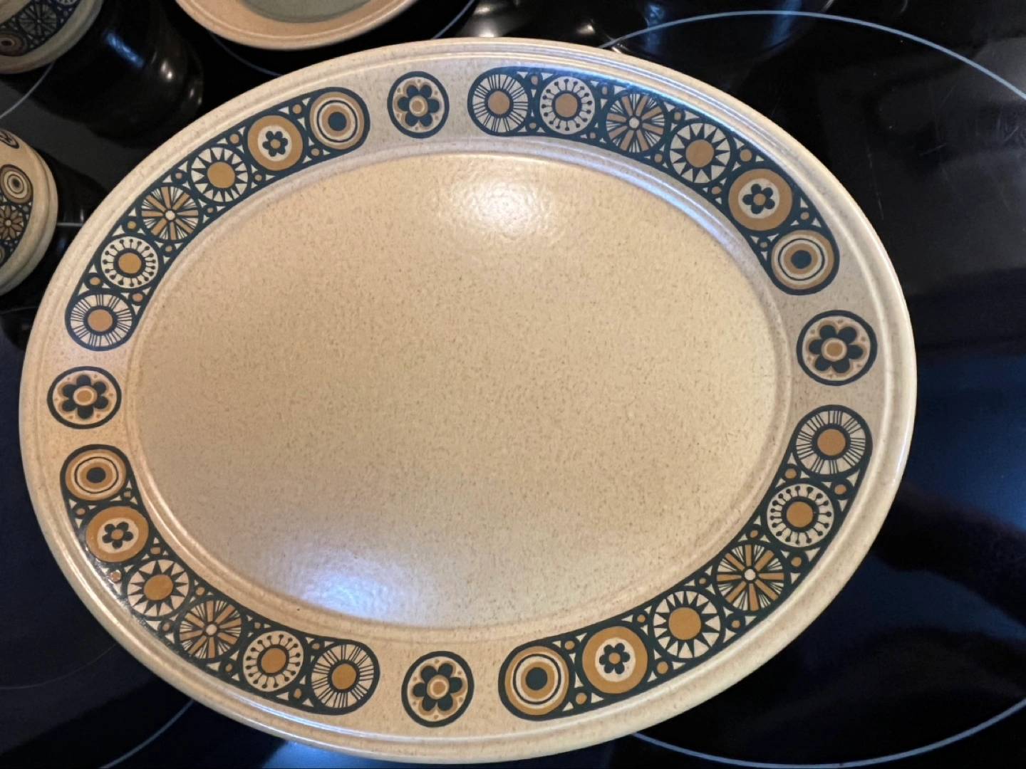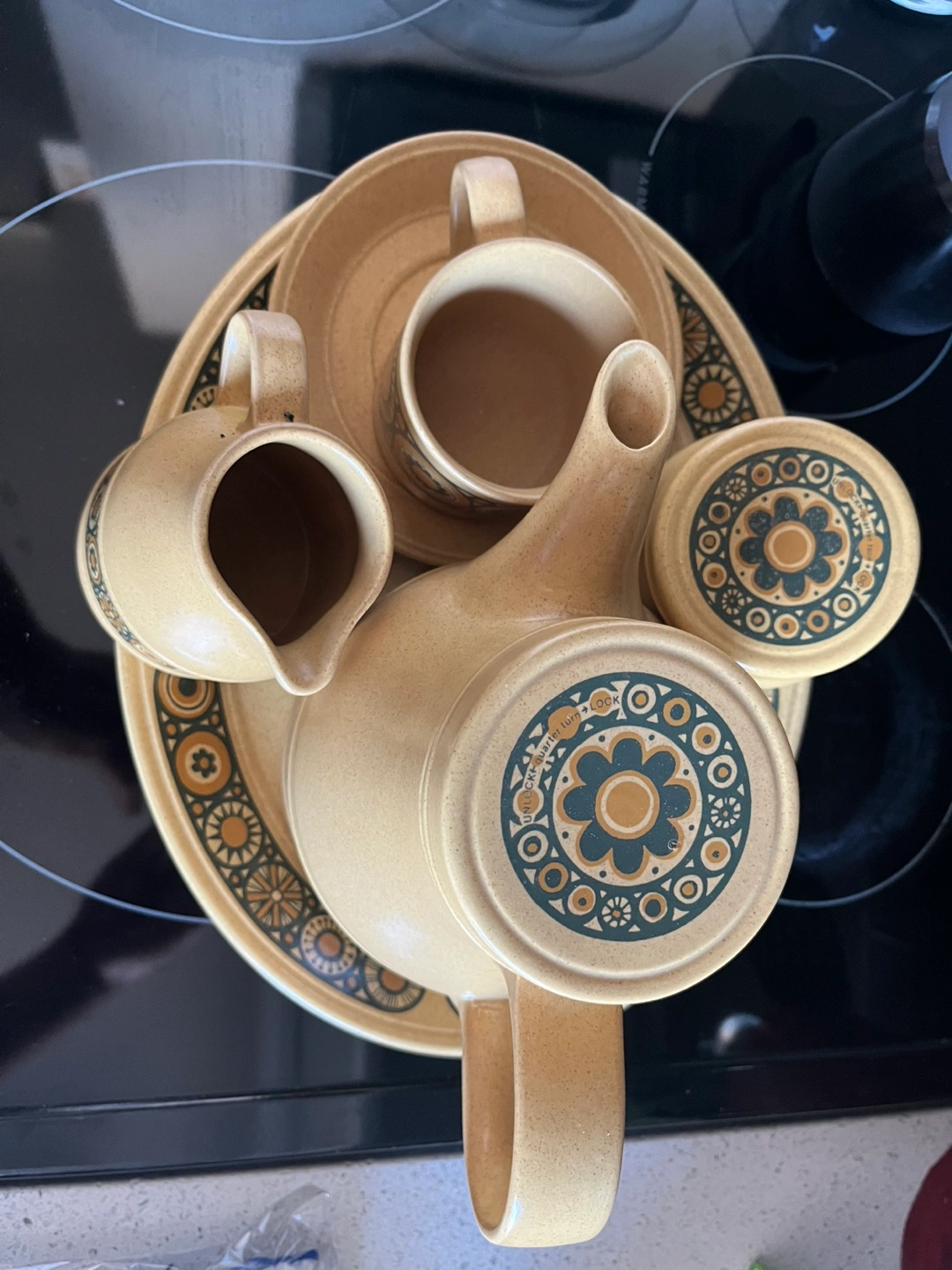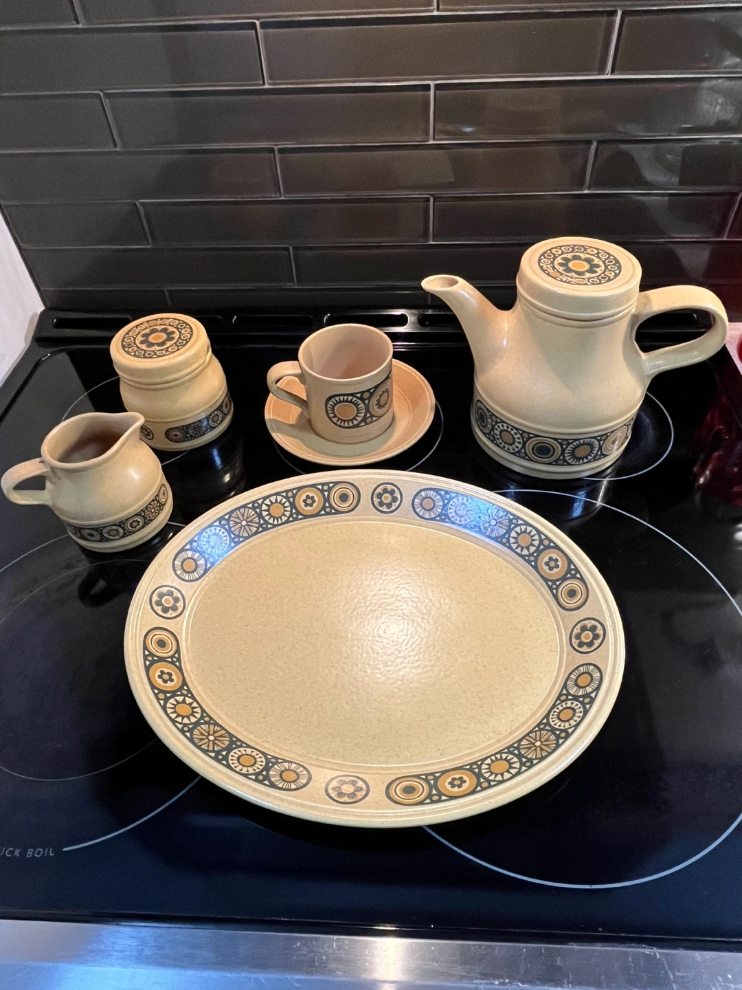 Beautiful vintage Kiln Craft Bacchus tea set. Includes teapot, milk jug, sugar bowl with lid, cup and saucer, and large serving platter. Made in England. Stoneware. Retro design. From 1970s. No chips or