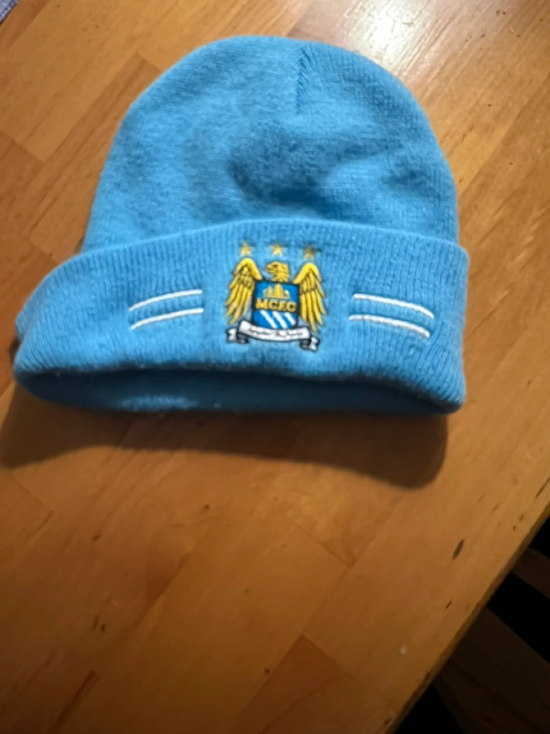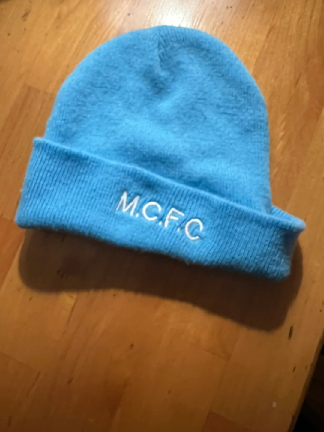 Manchester City Football Club merchandise bundle. Includes a light blue beanie and a matching scarf. Scarf features the official member logo. Beanie has embroidered M.C.F.C logo. Perfect for showing your team spirit.