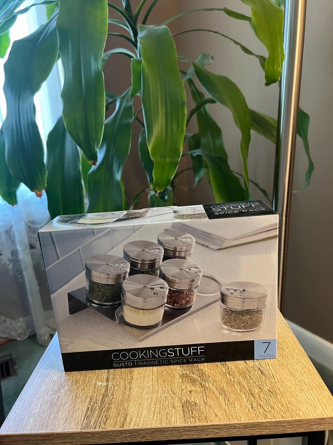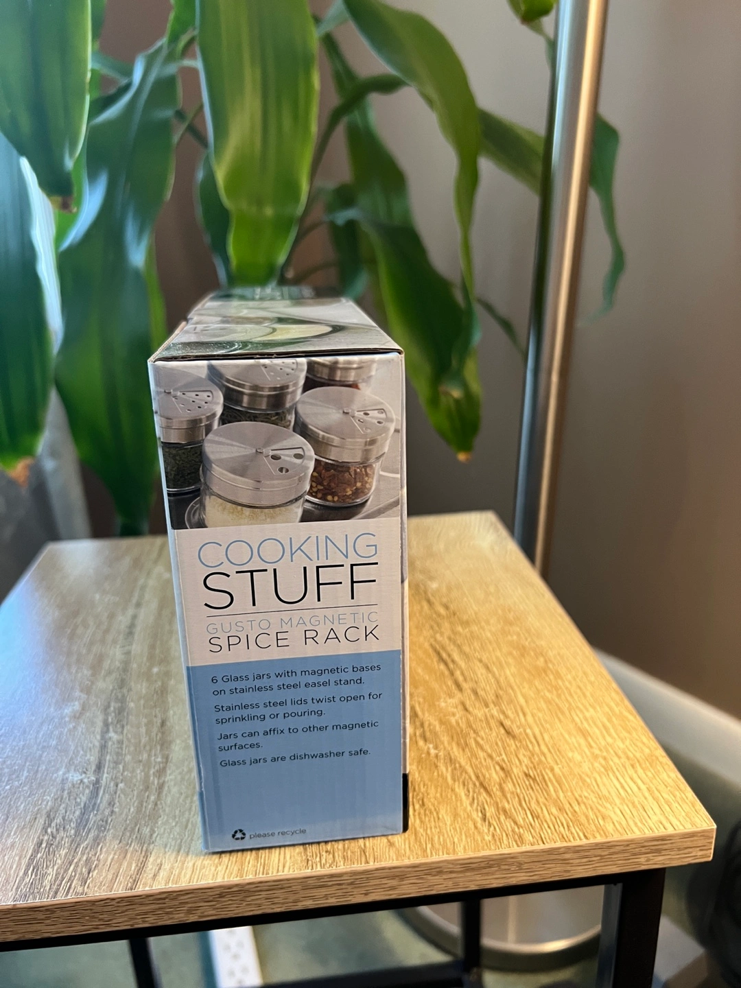 New in box. Seven-piece spice rack. Includes six glass jars with magnetic bases and a stainless steel easel stand. Stainless steel twist cap for easy pouring. Jars affix to other magnetic surfaces. Glass jars are dishwasher safe.