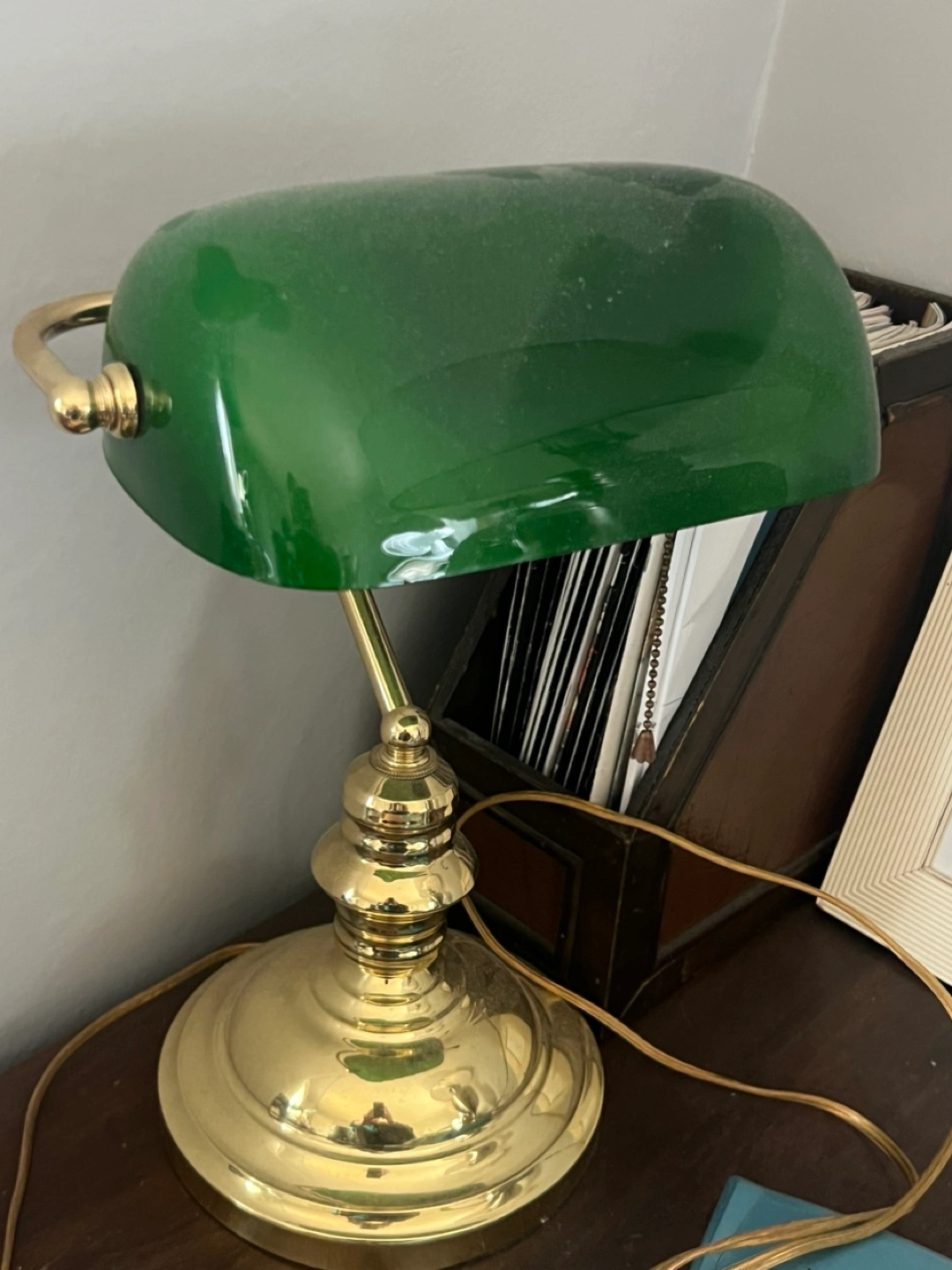 Beautiful vintage banker's lamp. Brass base and green glass shade. Excellent for a desk or bedside table. Shows some minor wear consistent with age and use.