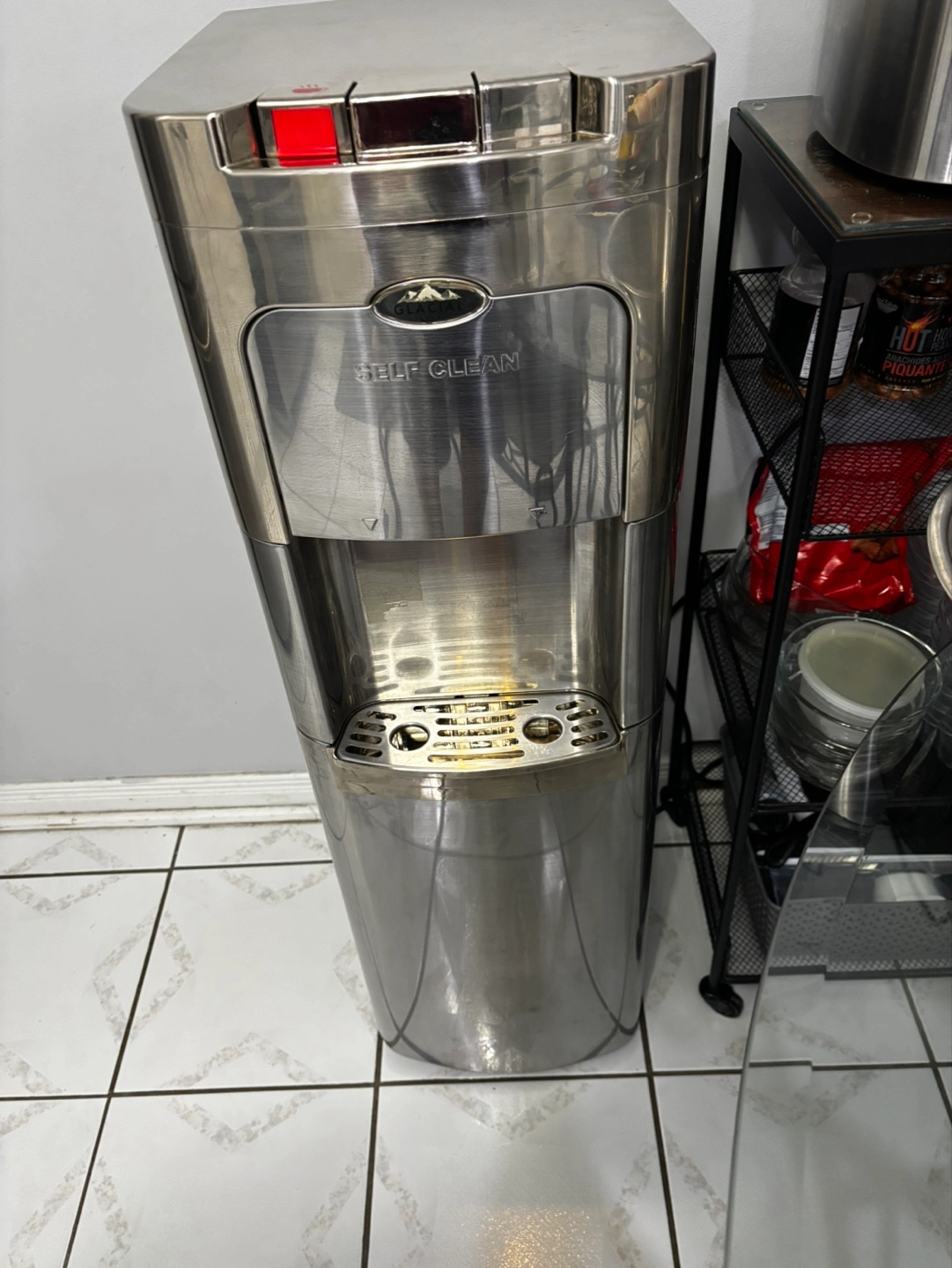 Freestanding water cooler, stainless steel finish. Features hot and cold water dispensers. Self-clean function. Accommodates large water bottles. Great for home or office.