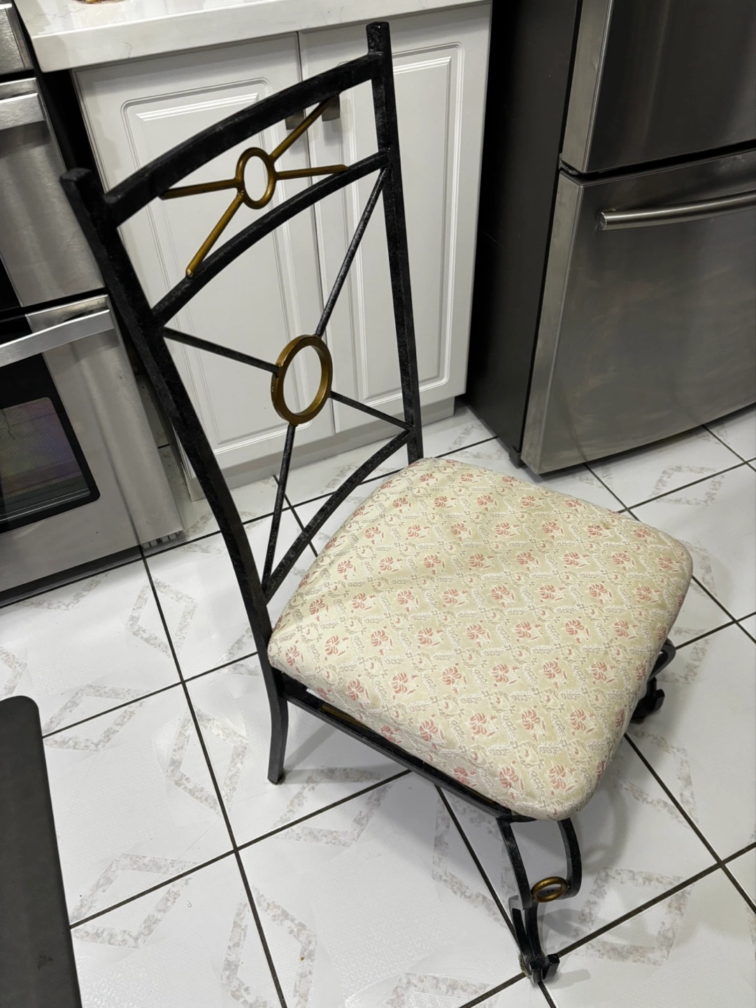 Ornate metal frame. Beige floral upholstery. Suitable for dining room or kitchen. In excellent condition can be reupholstered.