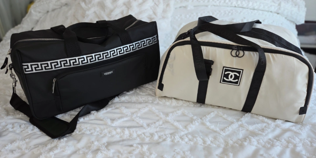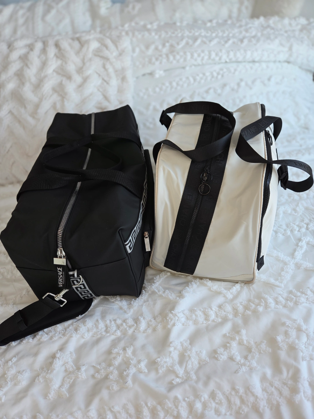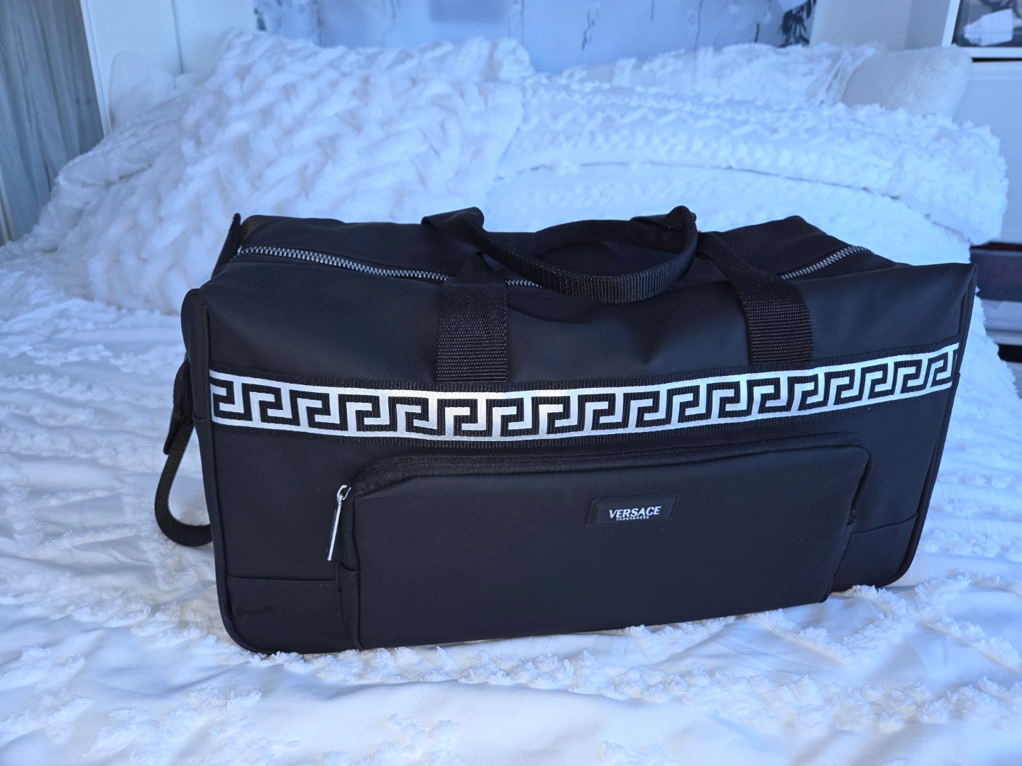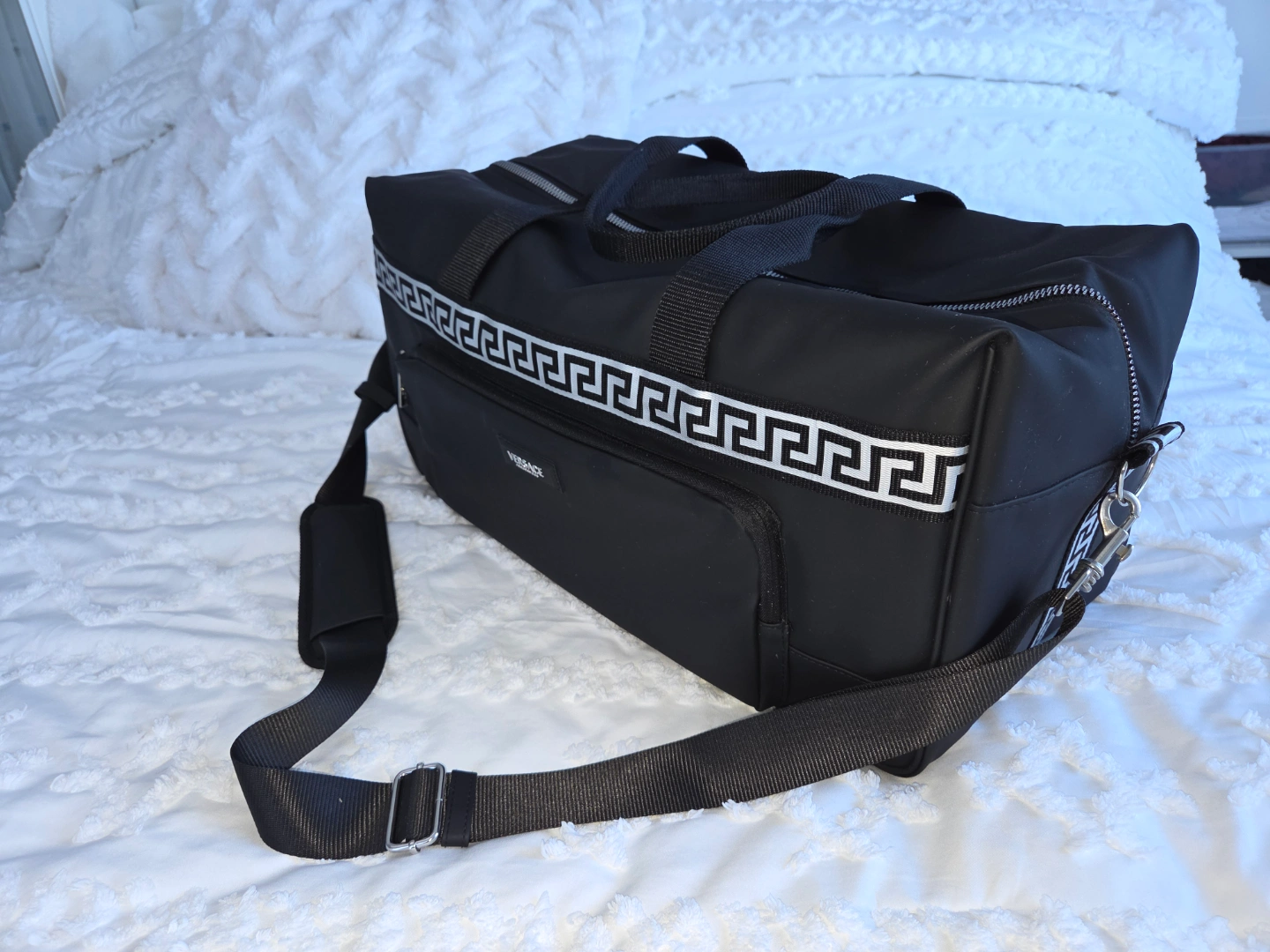 Black duffel bag. Features a Greek key design. Zipper closure. Adjustable shoulder strap. Small front pocket. Excellent for travel.