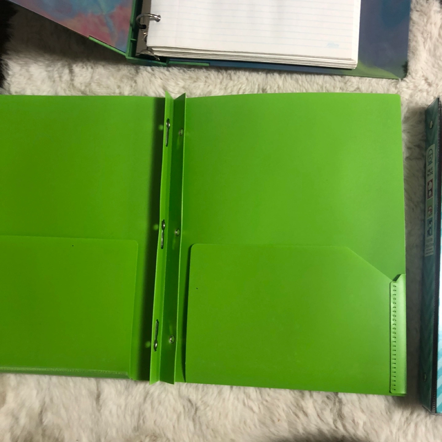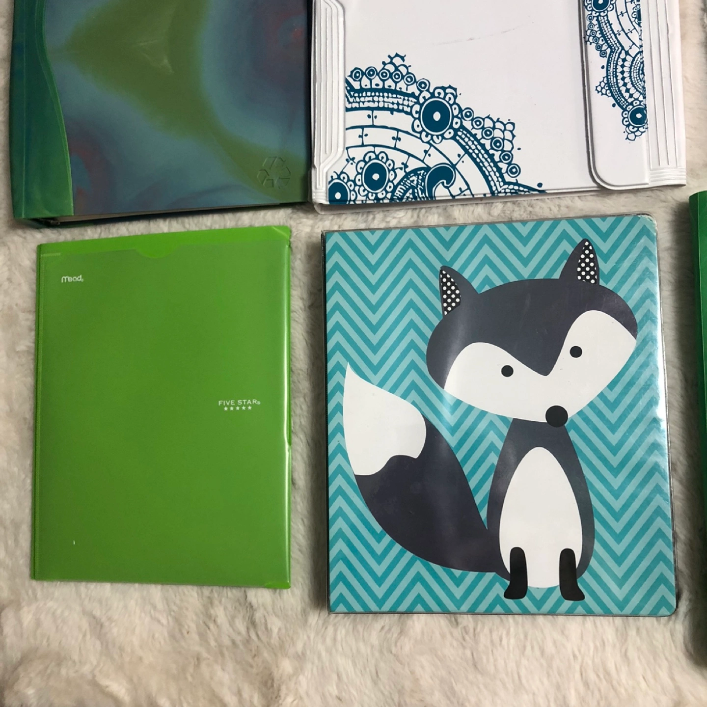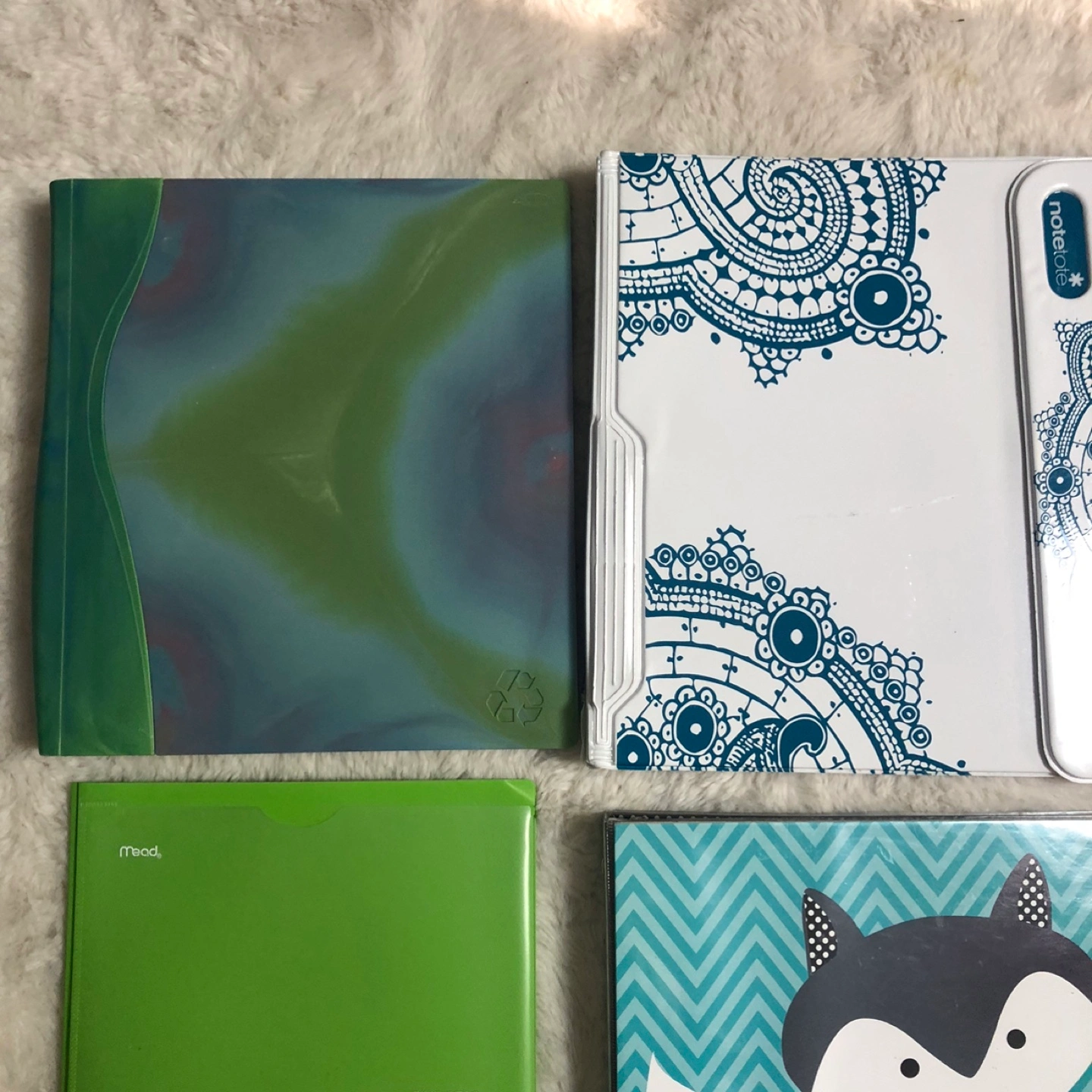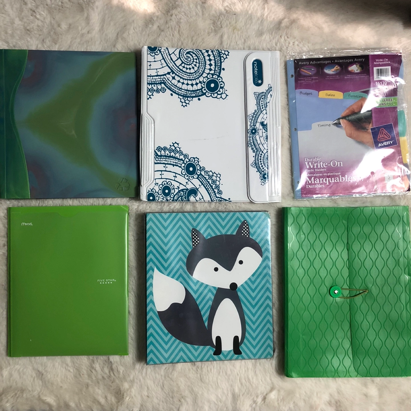 Set of colorful binders and folders with unique designs. Includes green and blue colors. Comes with everything pictured. In good condition. Please view all pictures. Cross posted, FCFS, NO HOLDS. Located in Ellerslie.