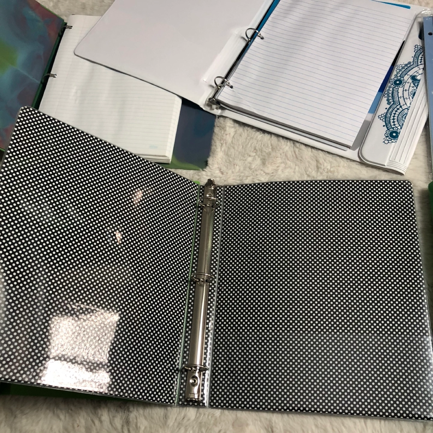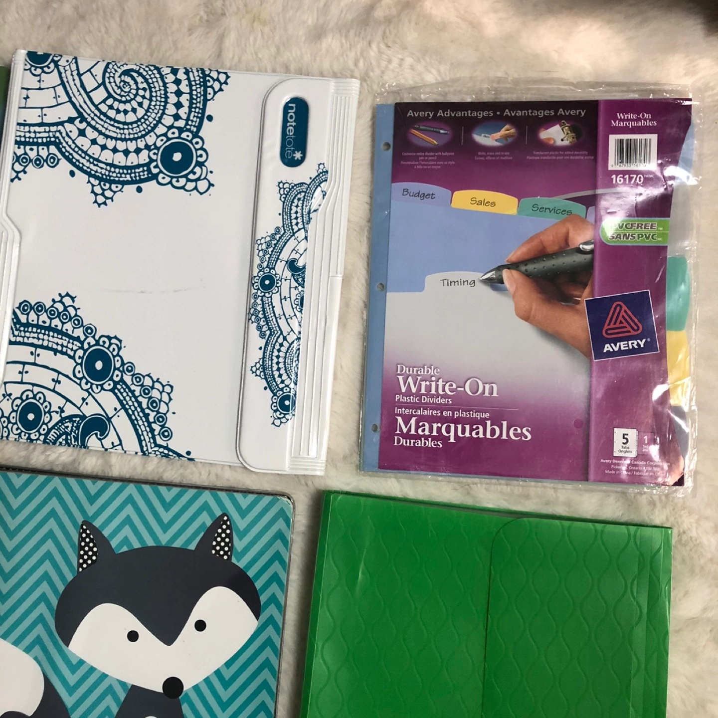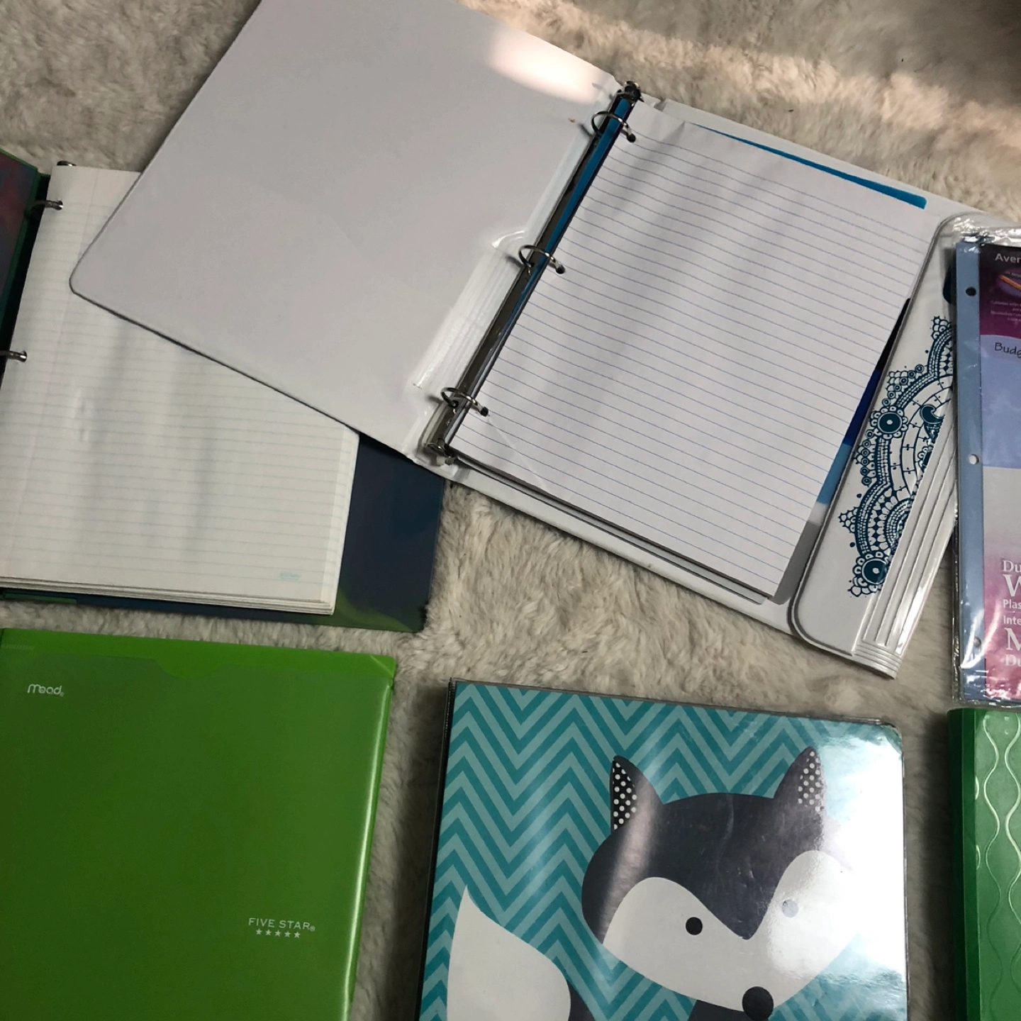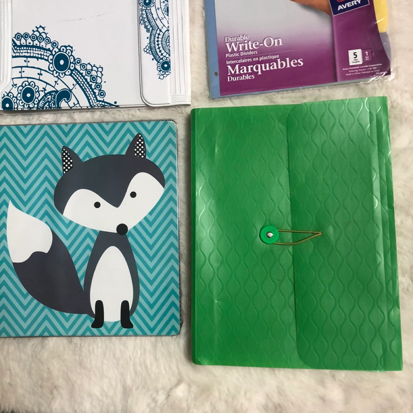 Set of colorful binders and folders with unique designs. Includes green and blue colors. Comes with everything pictured. In good condition. Please view all pictures. Cross posted, FCFS, NO HOLDS. Located in Ellerslie.