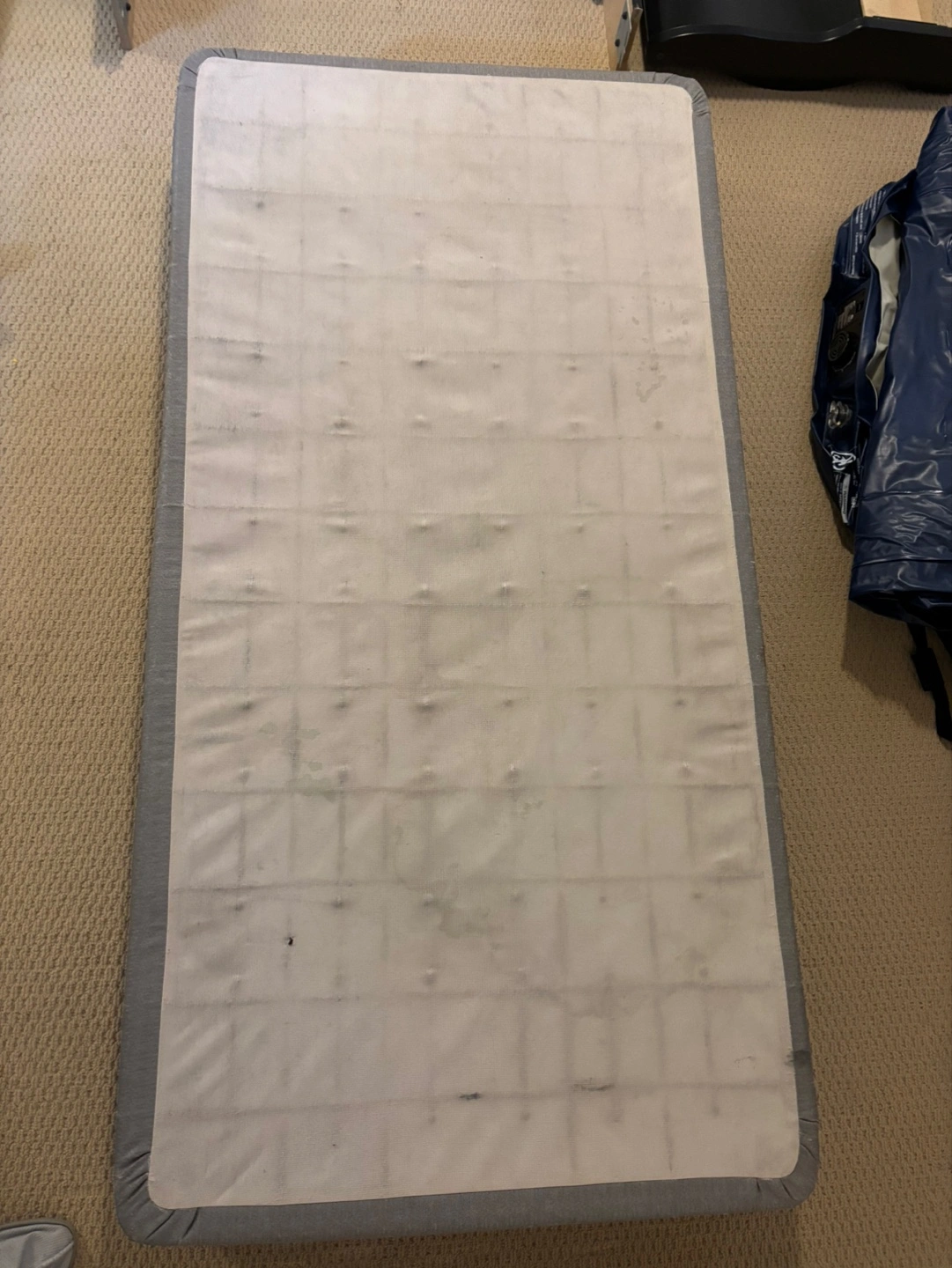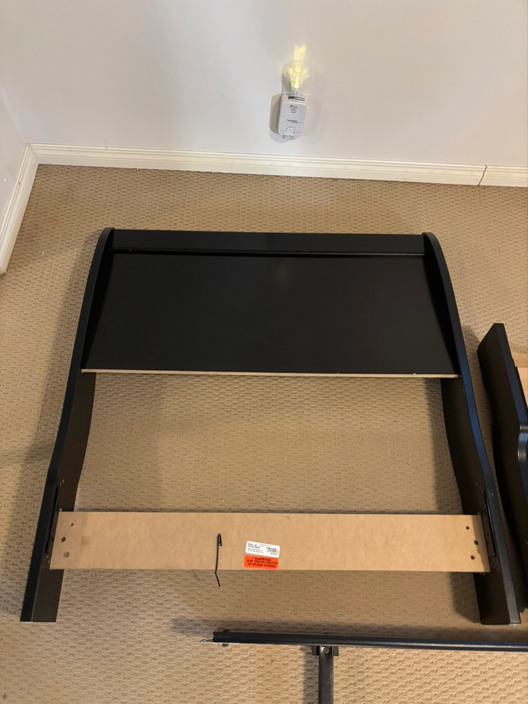 Full-size bed frame, black finish. Includes headboard, footboard, side rails, and box spring. Some minor wear and tear. Disassembled for easy transport.