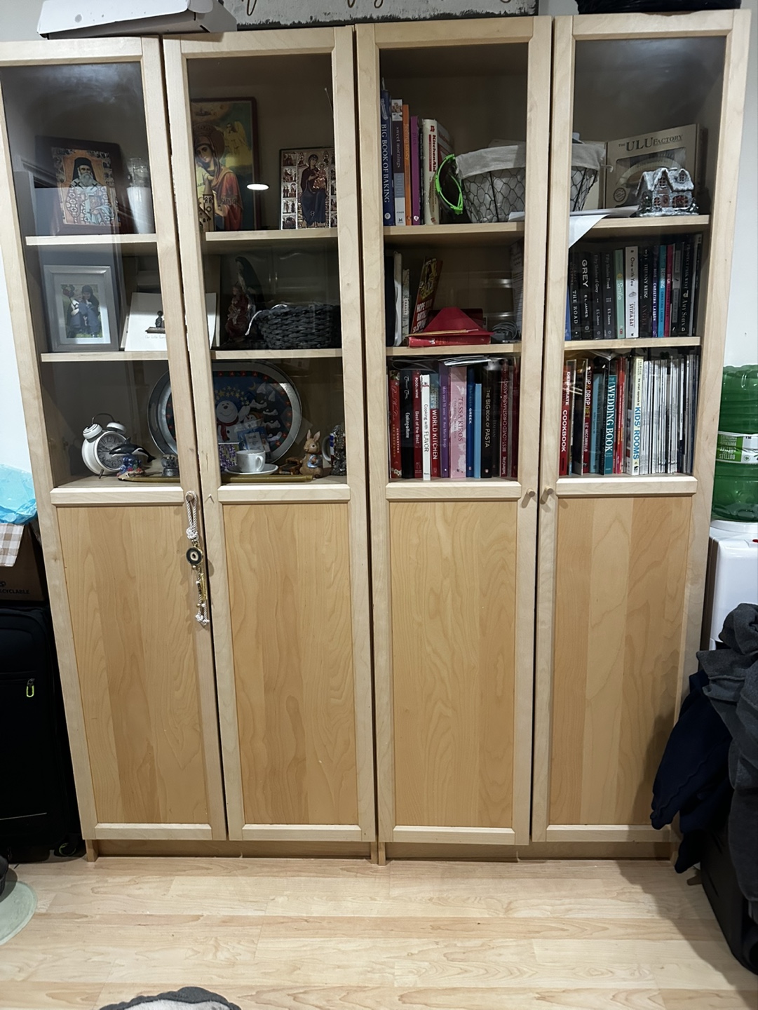 Set of two light-coloured wooden bookcases. Glass doors on upper sections, solid wood doors on lower. Each unit features several shelves. Great for storing books, collectibles or other items.