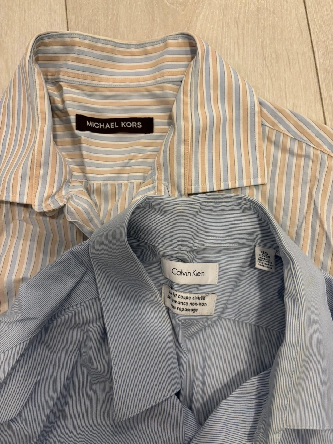 Pair of Michael Kors Calvin Klein men's long-sleeve dress shirts. One light blue and white striped Calvin Klein shirt. One light pink, beige and blue striped Michael Kors shirt. Both in good condition.