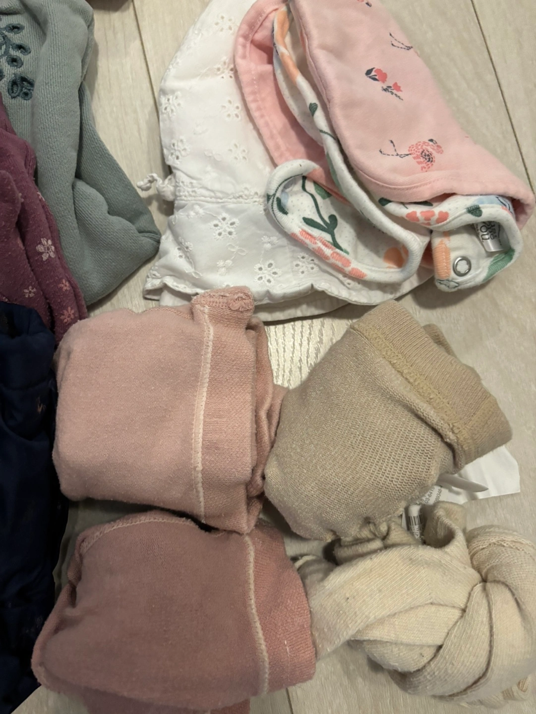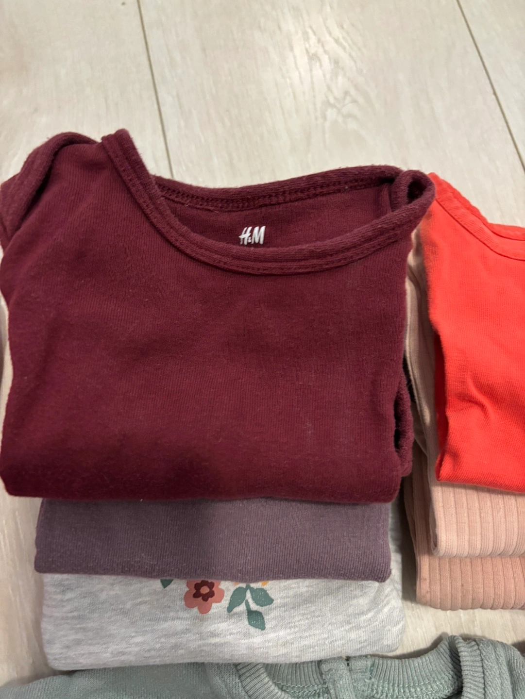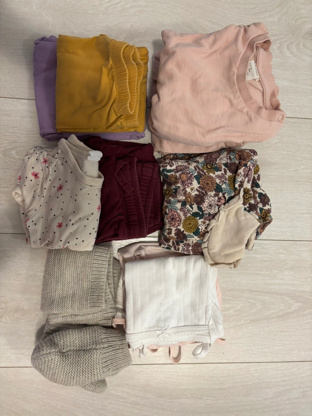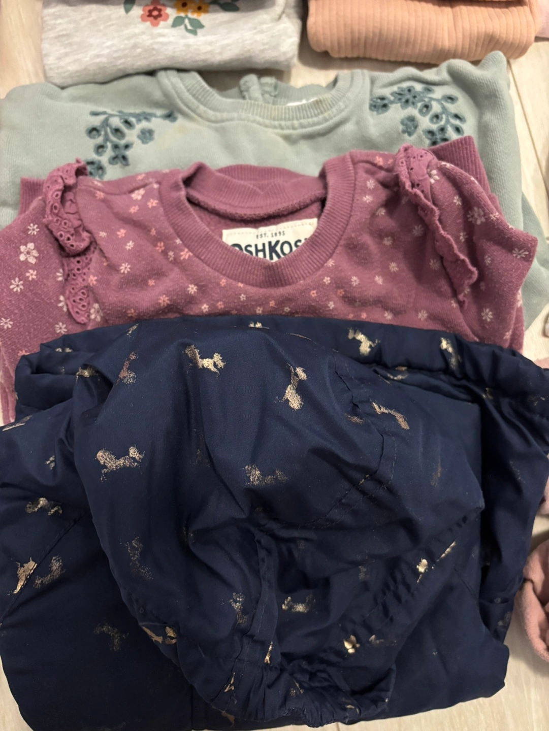 Large bundle of baby girl clothes, size 12-18 months. Includes tops, bottoms, jackets, and more. Various colours and patterns. Perfect for fall and winter. Some items from Zara, OshKosh and H&M.