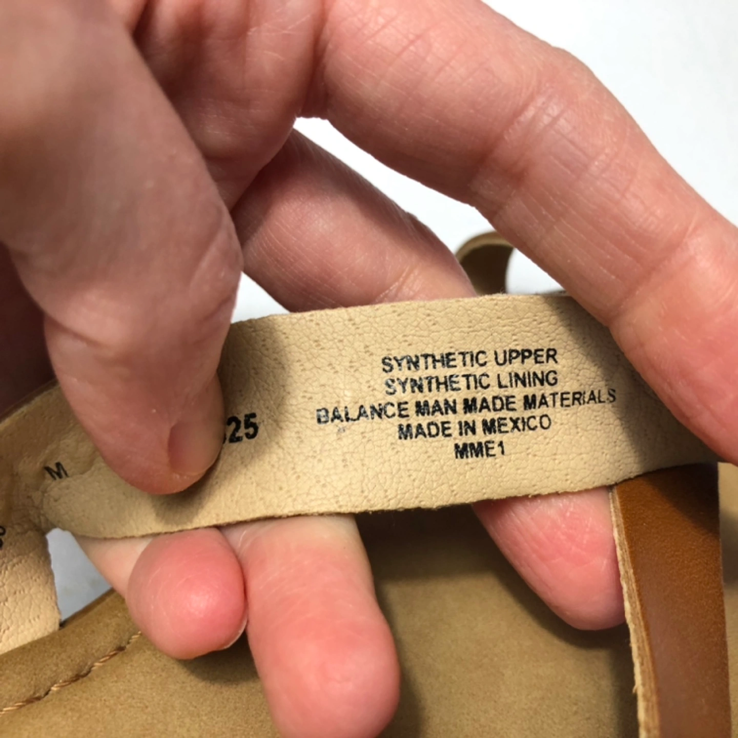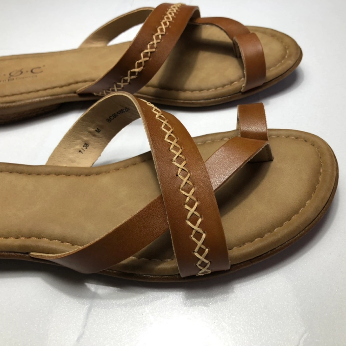 Women's tan faux leather sandals. Size 7. Features crisscross straps and a toe thong.