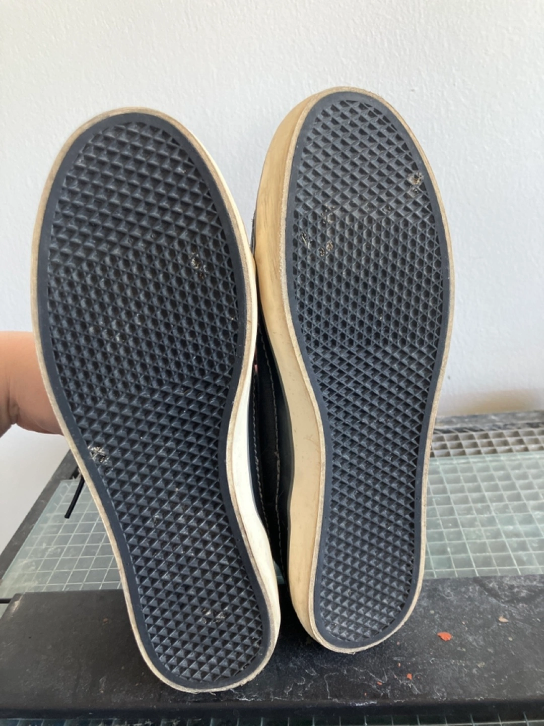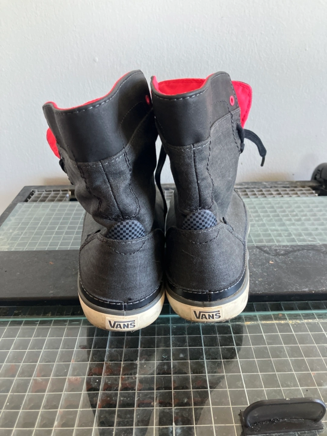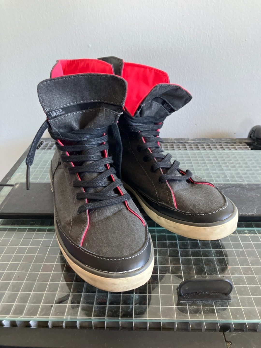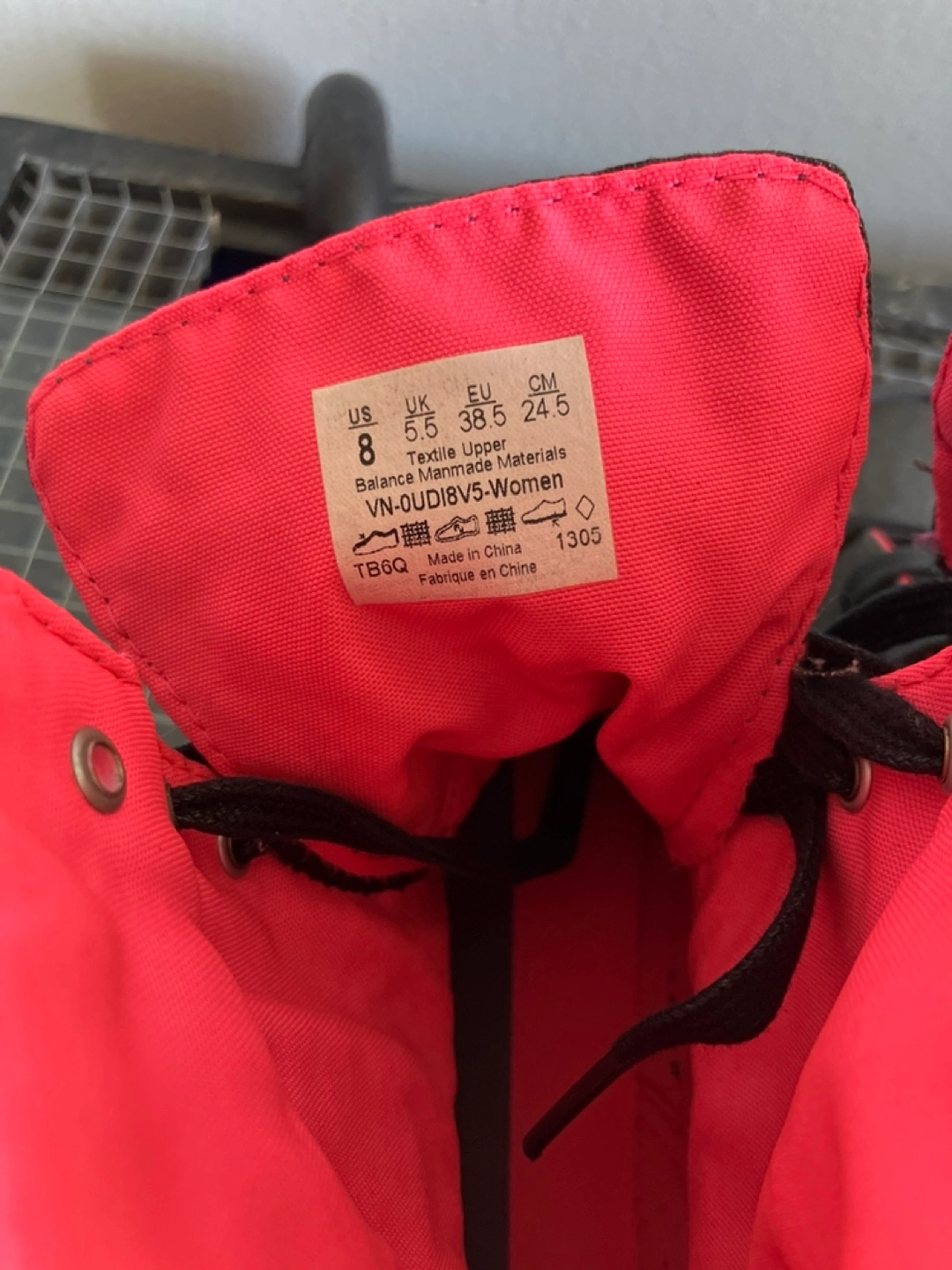 Women's high top Vans sneakers. Black canvas upper with pink accents. Size 8. Lace-up closure.