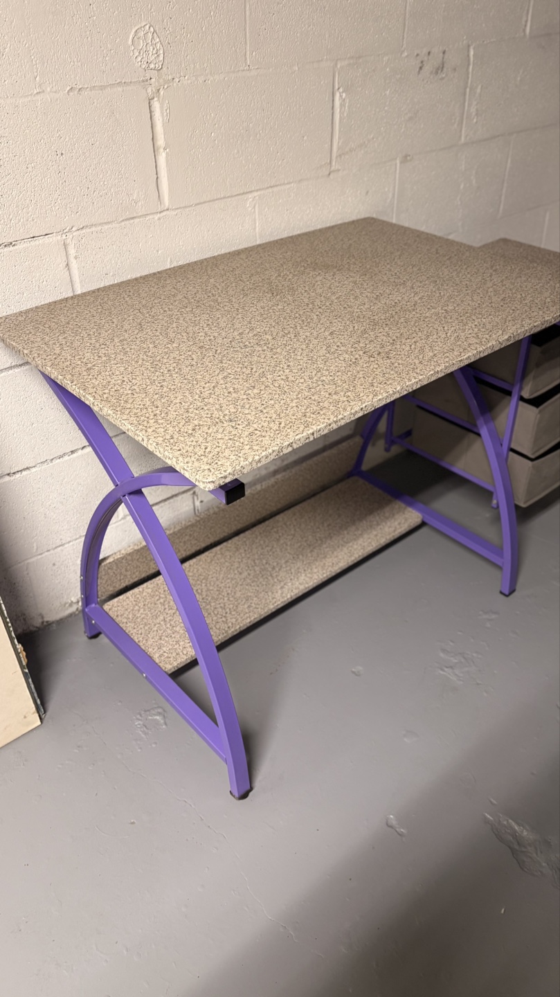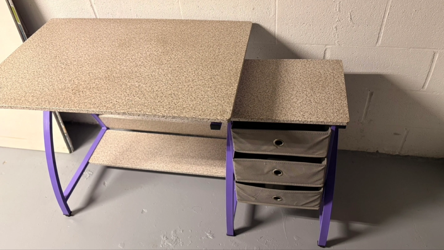 Two-piece craft desk. Features a large work surface and a smaller side unit with three fabric drawers. Purple metal frame. Granite-look top.